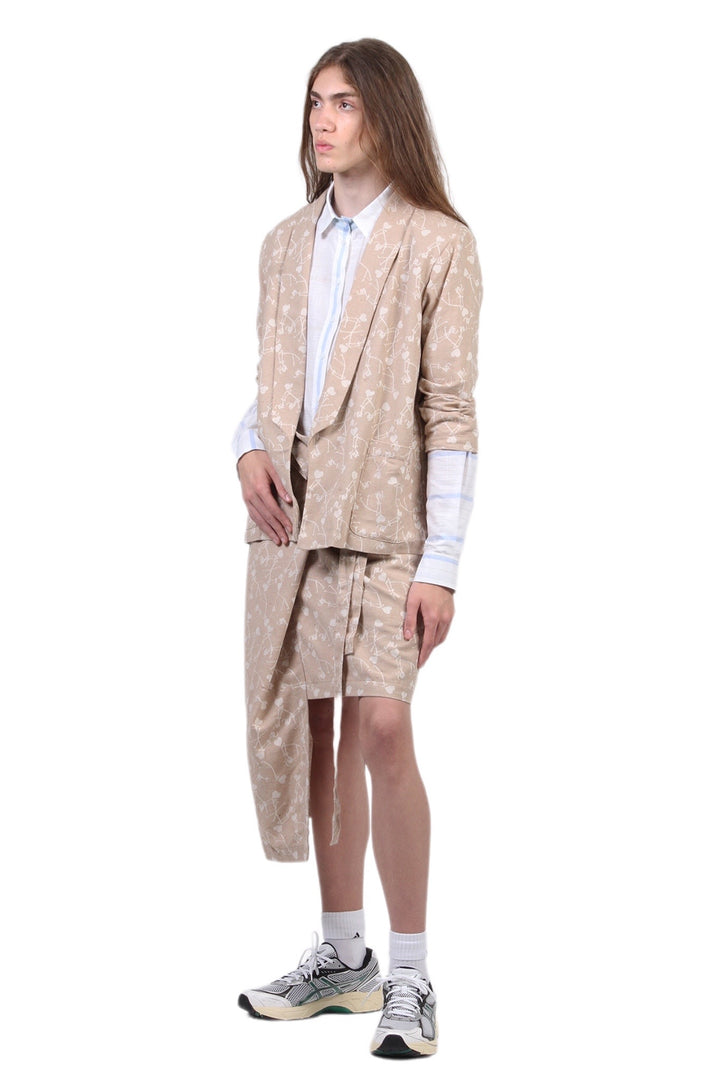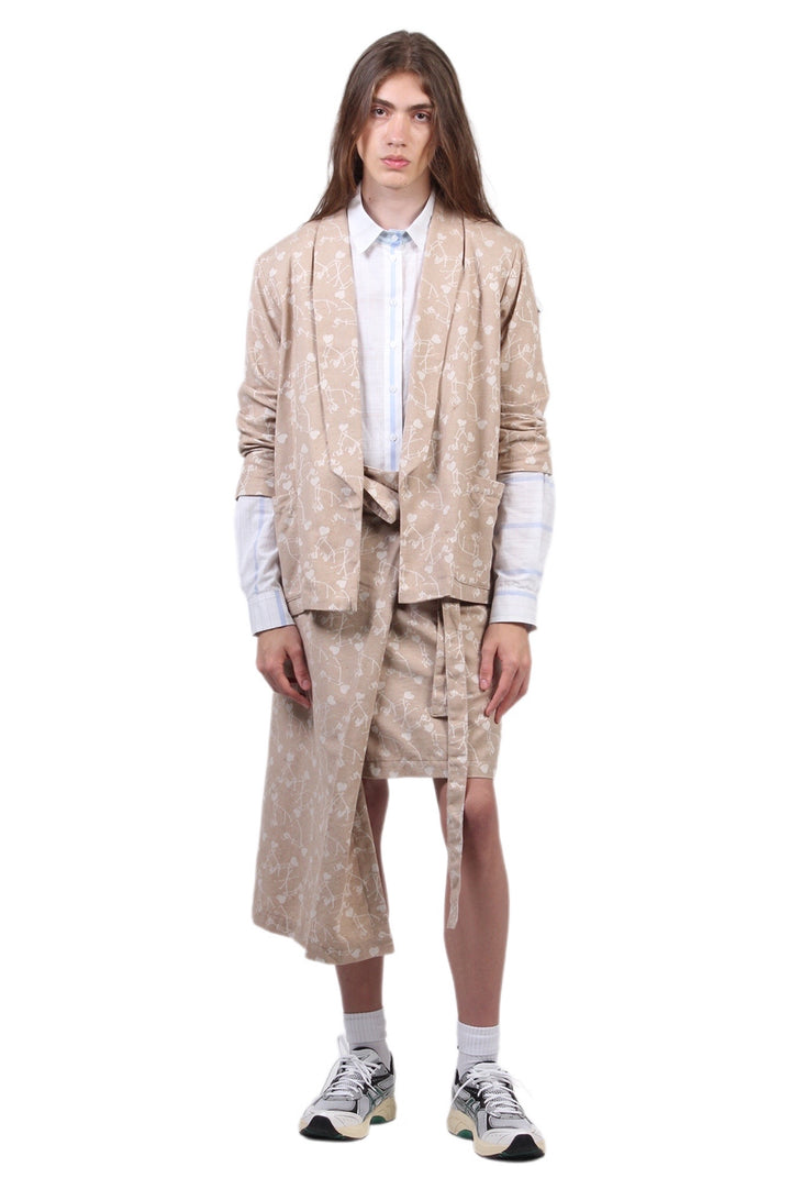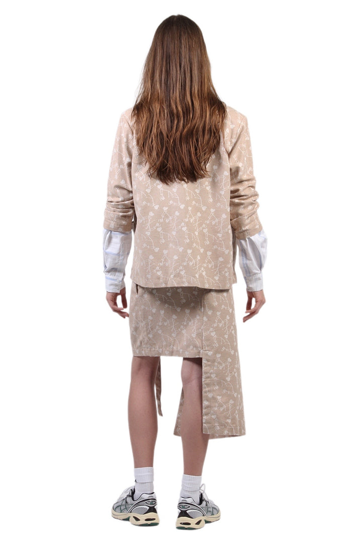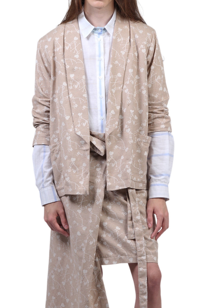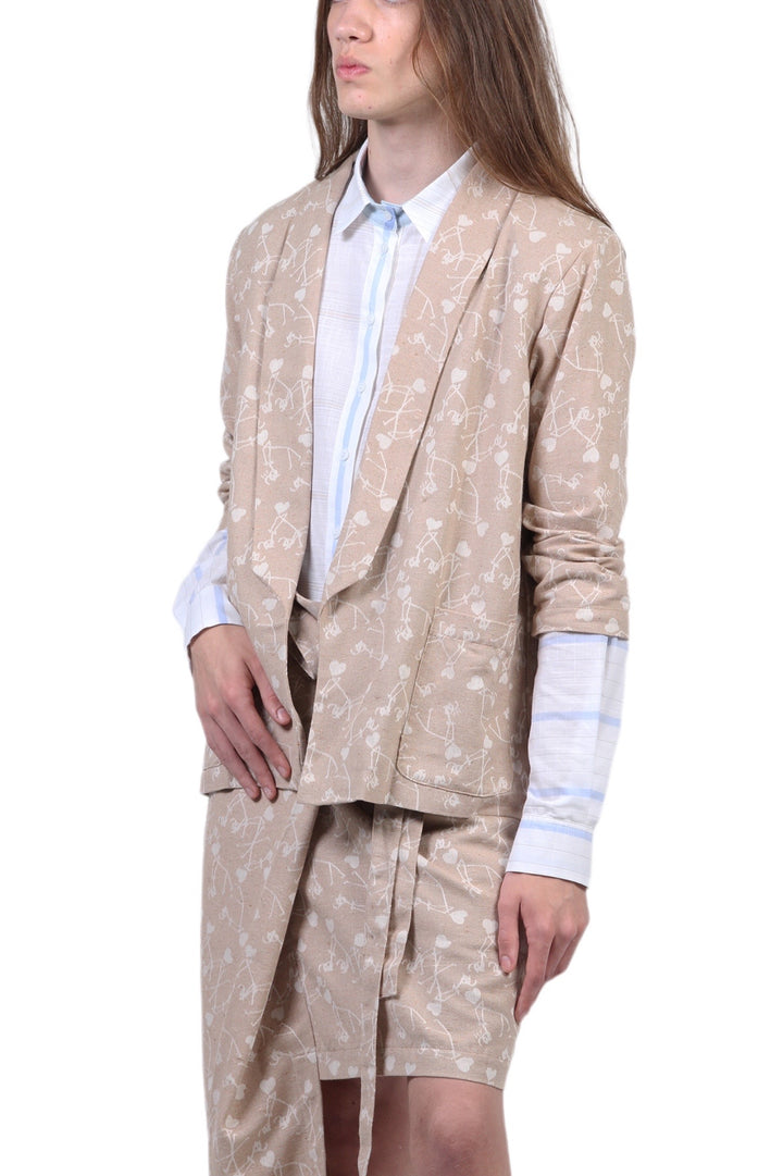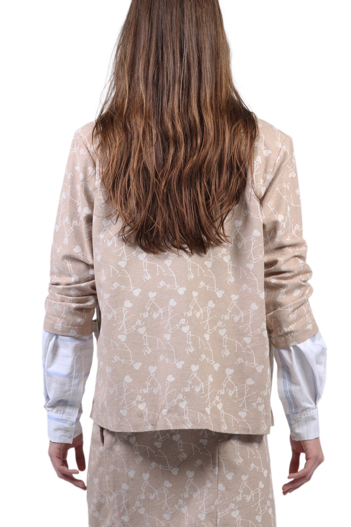 O Blazer Coração é uma peça feita de tecido jacquard com estampa criada a partir de um tipo, peça de xilogravura, garimpado pela estilista em um mercado de pulgas.