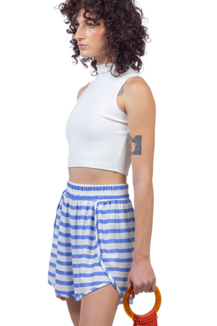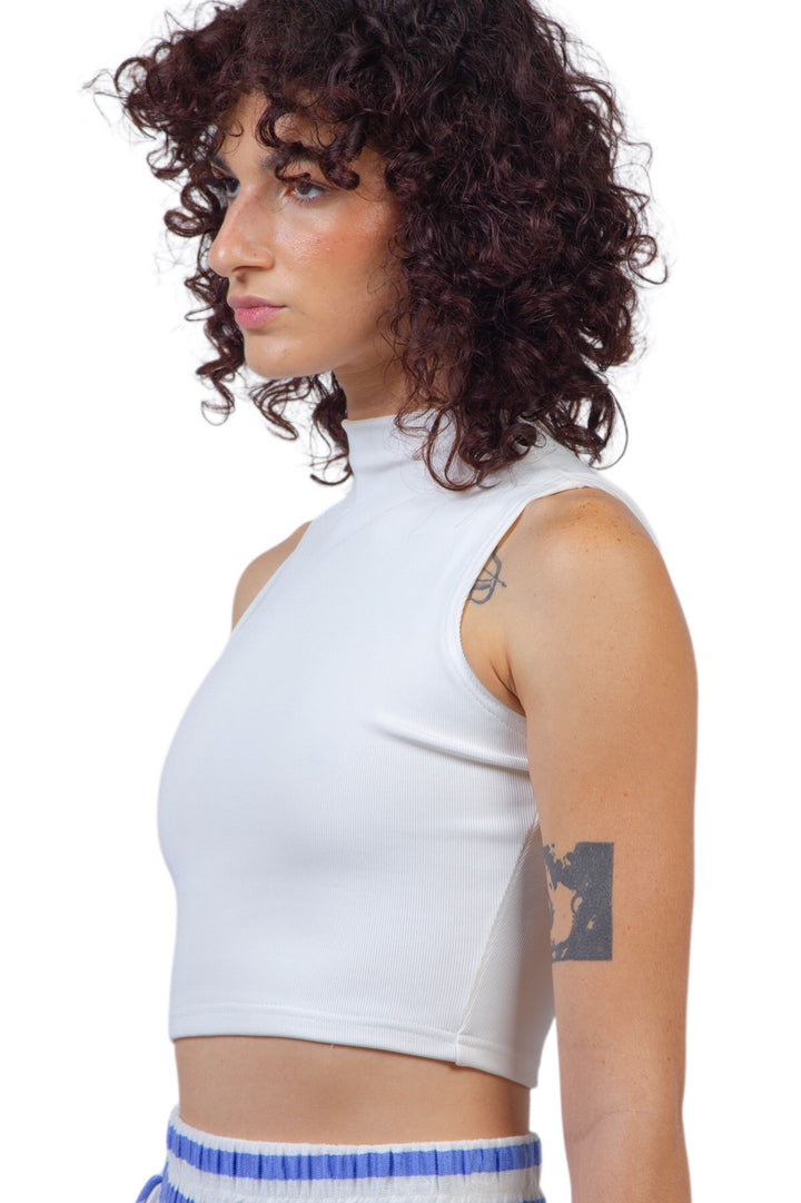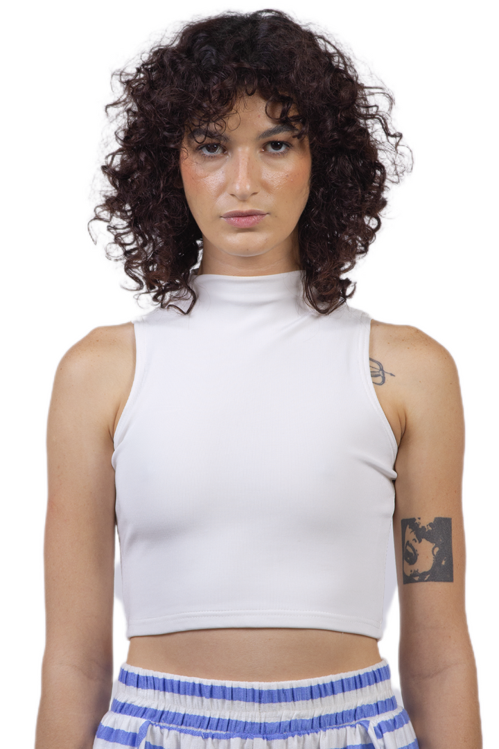 A Blusa Branca é feita de malha com elastano de ótima qualidade. A peça é forrada e tem a gola de altura média. O comprimento cropped é um pouco acima do umbigo e sem mangas.