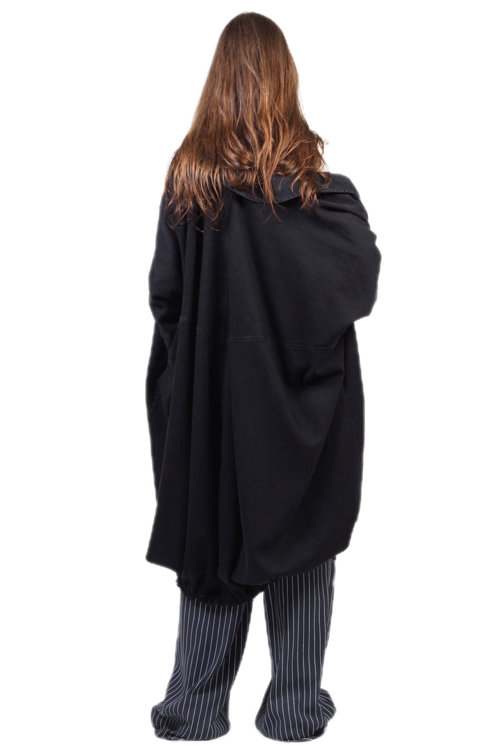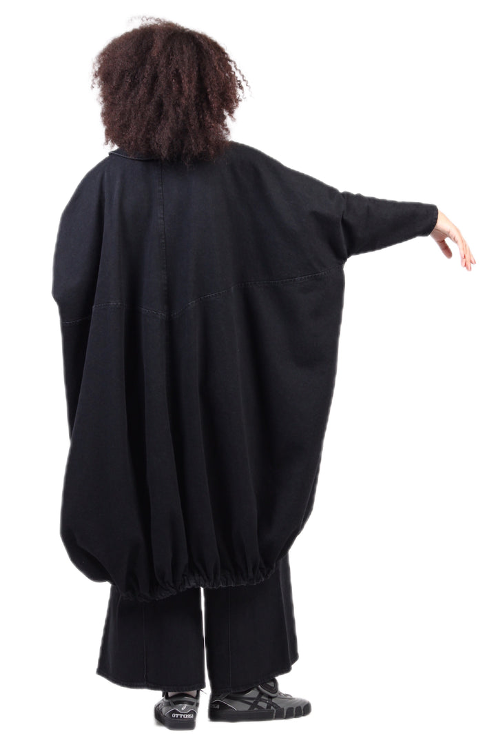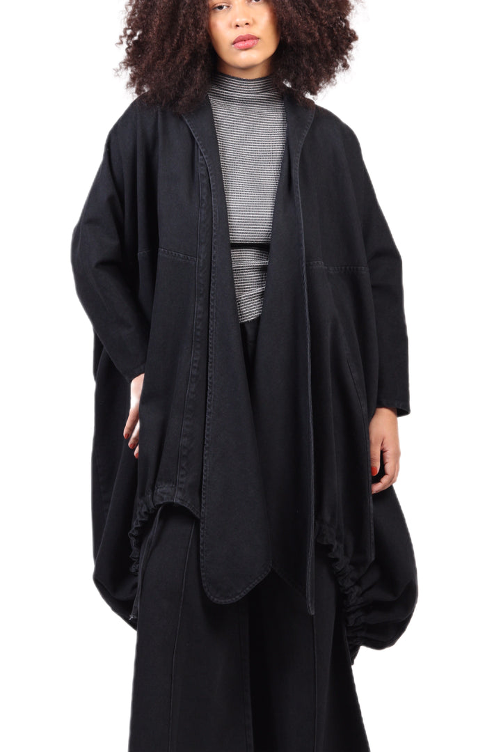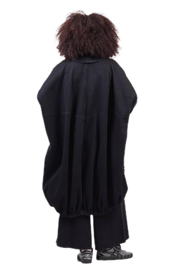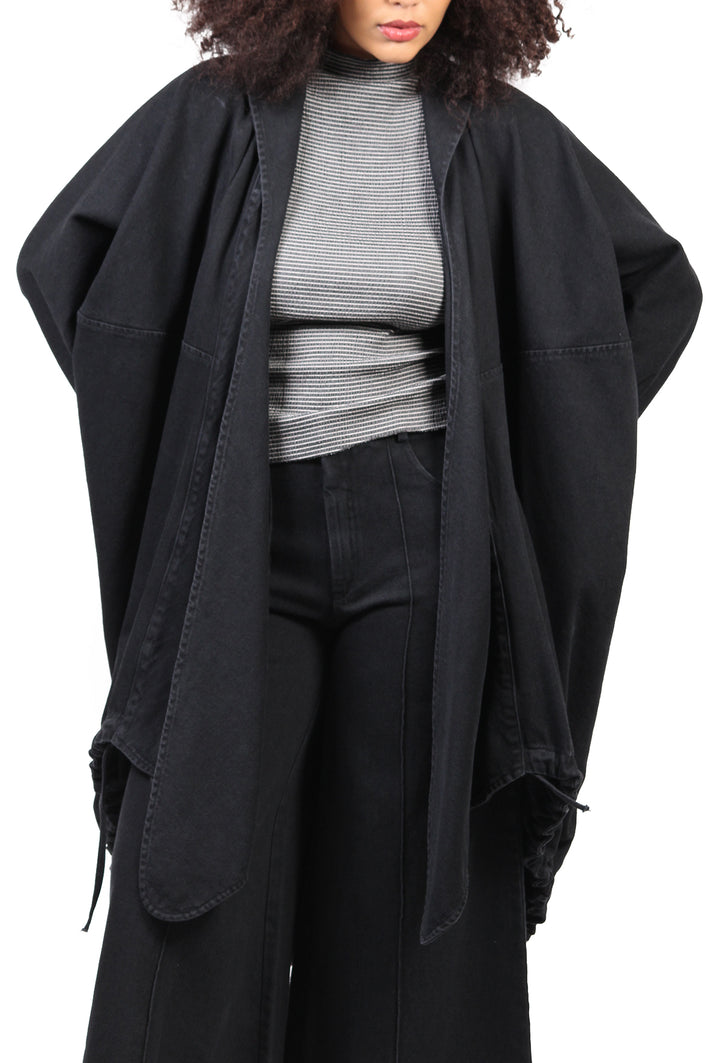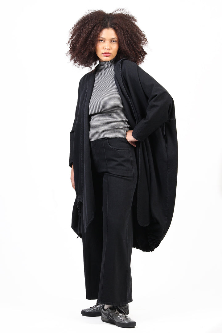 O Boro Black Jeans é uma capa oversize feito de jeans preto com bolsos laterais. Comprimento médio na altura dos joelhos e barrado com regulagem de amarração. Abertura frontal sem fecho.