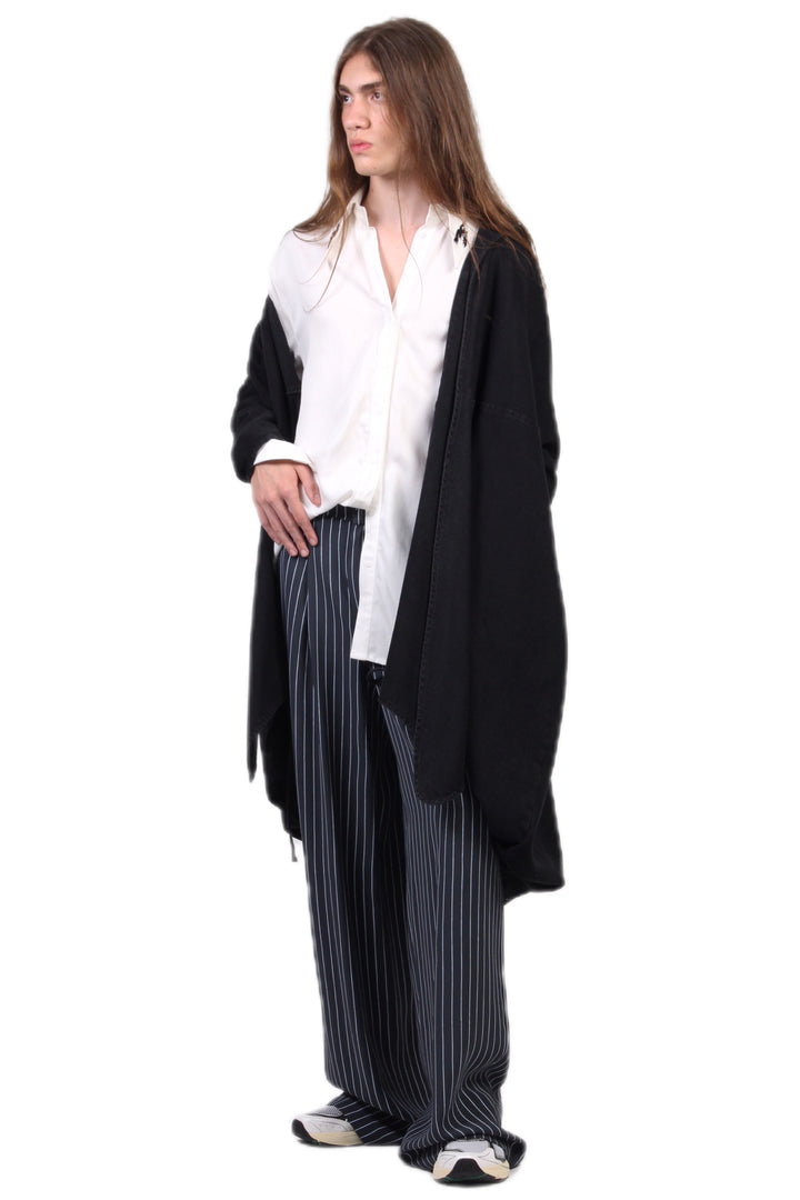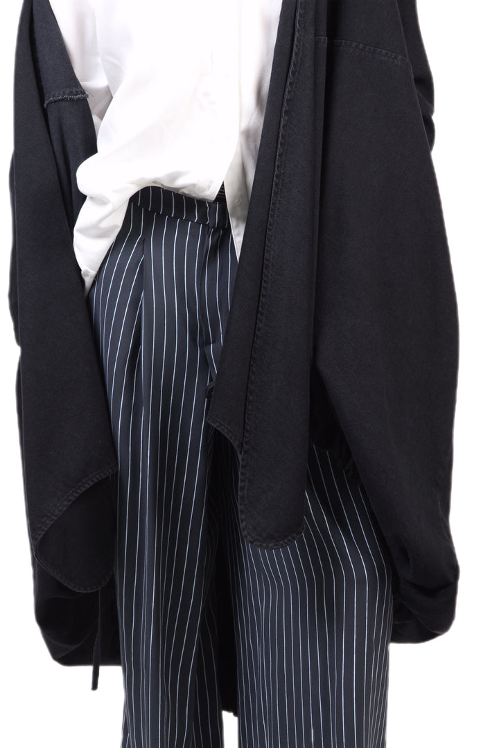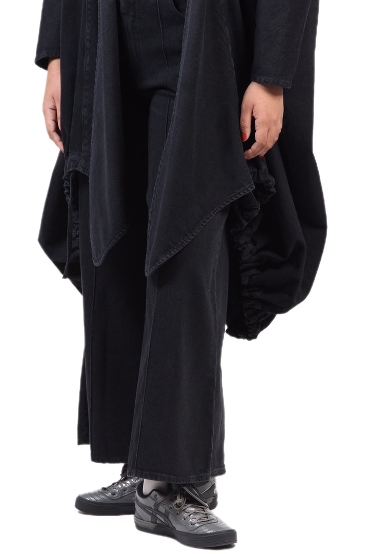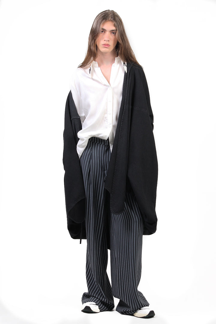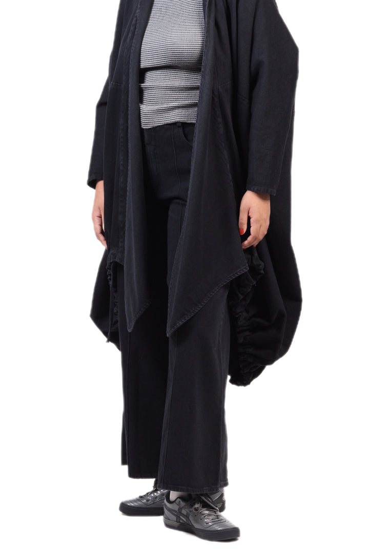 O Boro Black Jeans é uma capa oversize feito de jeans preto com bolsos laterais. Comprimento médio na altura dos joelhos e barrado com regulagem de amarração. Abertura frontal sem fecho.