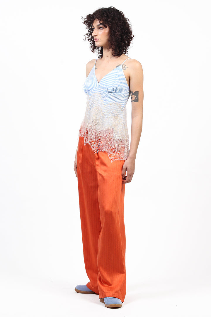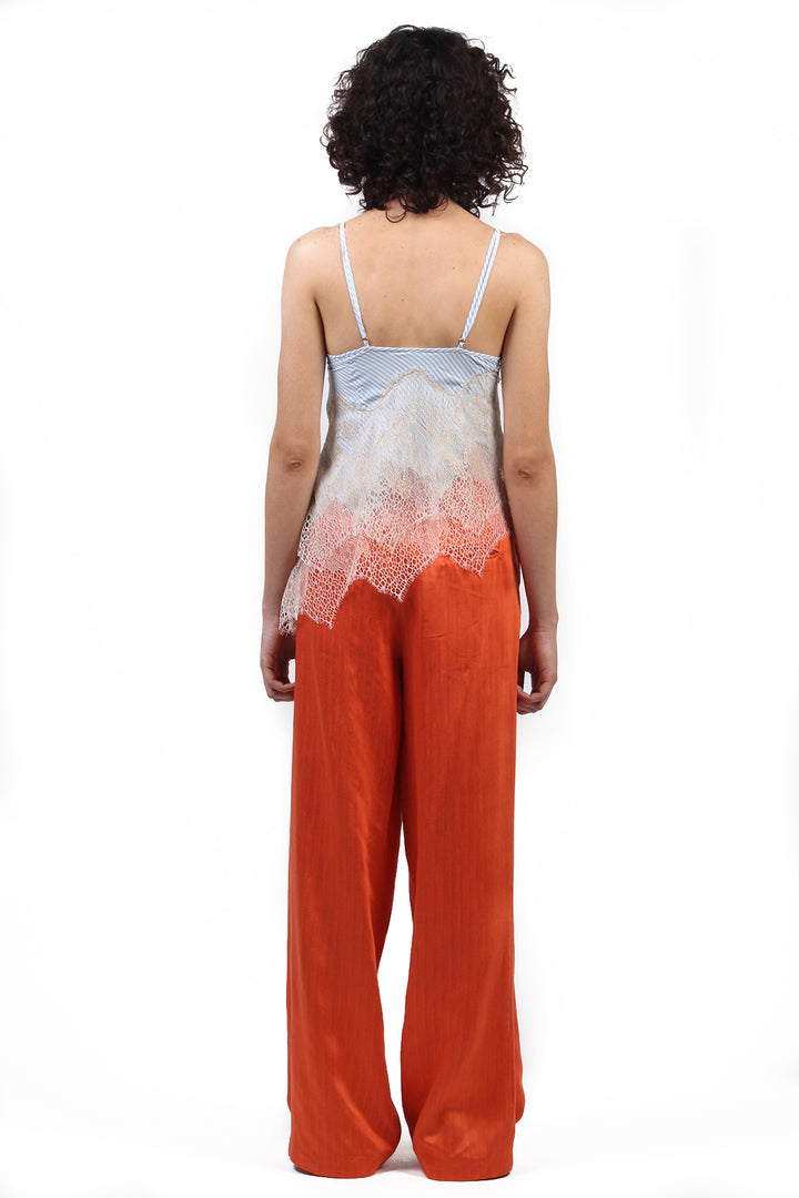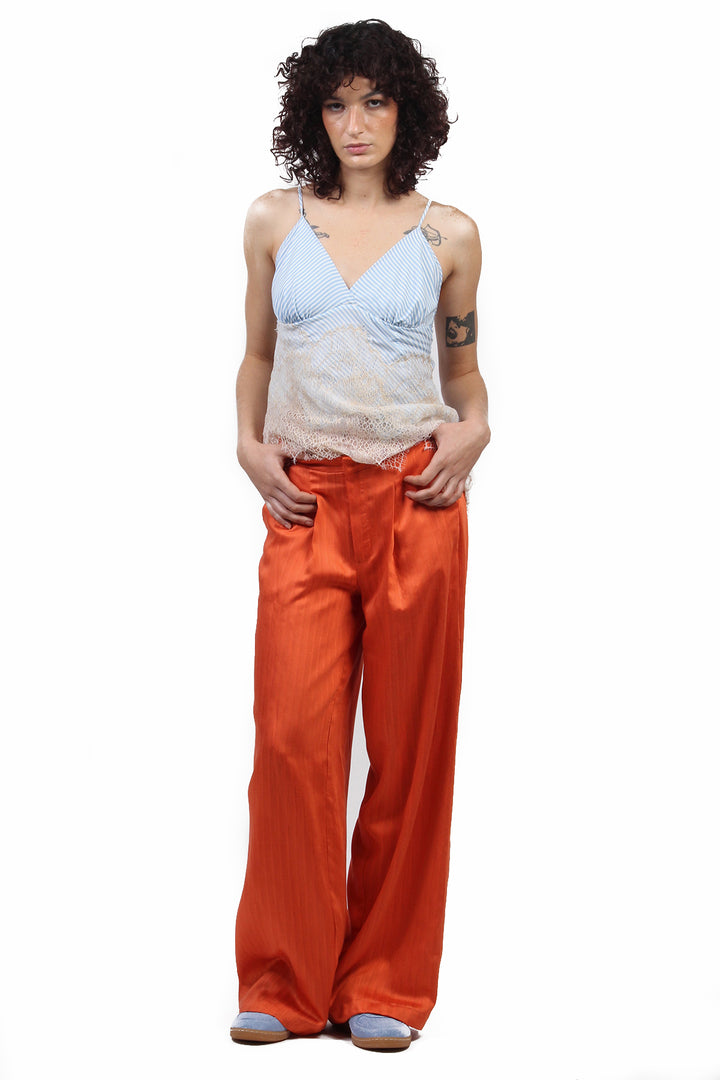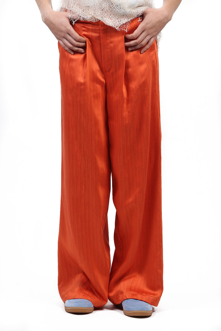 A Calça Alfaiataria Laranja é feita com tecido tecnológico da G. Vallone com seda em sua composição. Por isso a Calça possui esse aspecto molhadinho, quando na verdade ela é bem maleável e extremamente confortável.