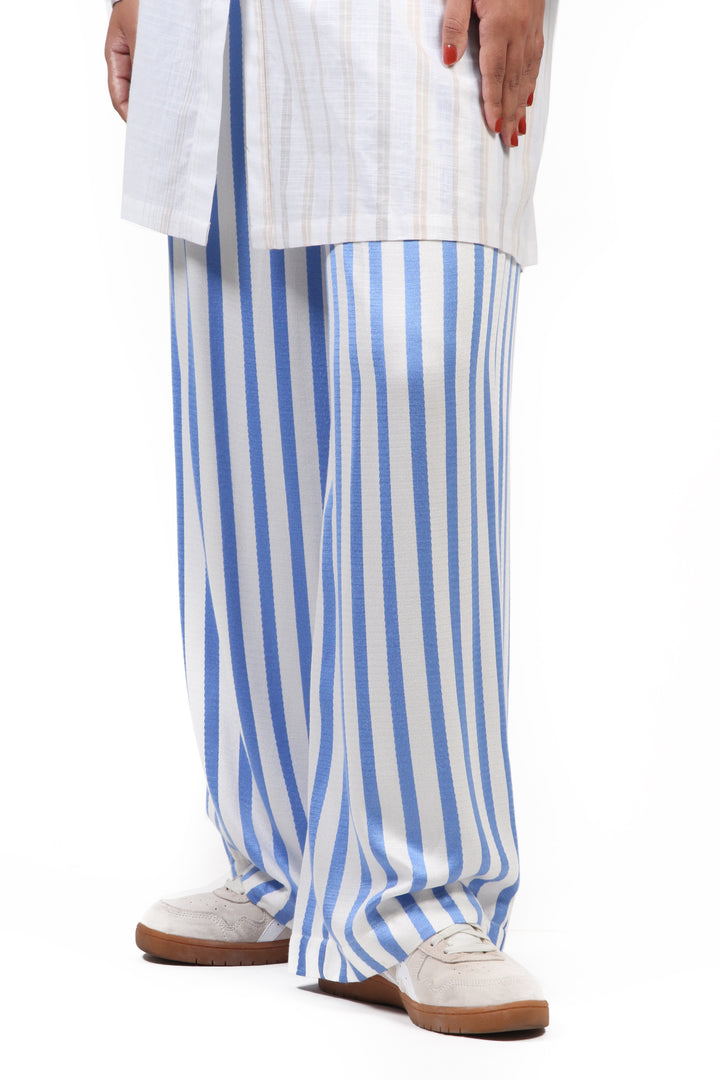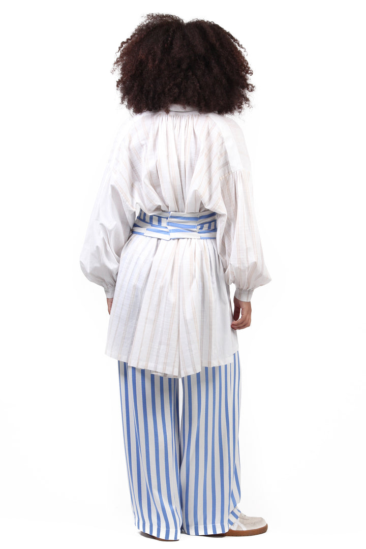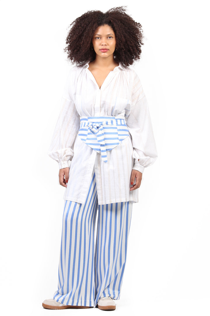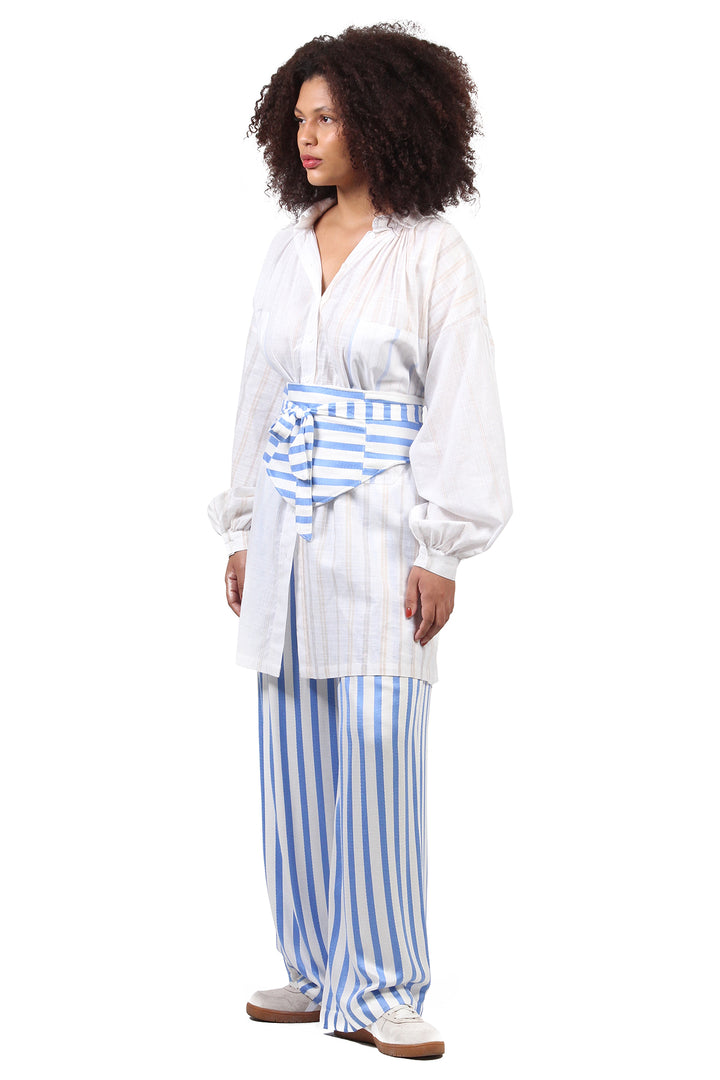 A Calça Listrada Azul é feita de uma seda tecnológica da tecelagem G.Vallone, extremamente confortável e de toque delicioso na pele. A peça tem modelagem ampla, mais soltinha no corpo, e com pregas que conferem aquele ar de alfaiataria. O fechamento é por zíper e botão. Daquelas peças que se tornam a compra inteligente no armário!