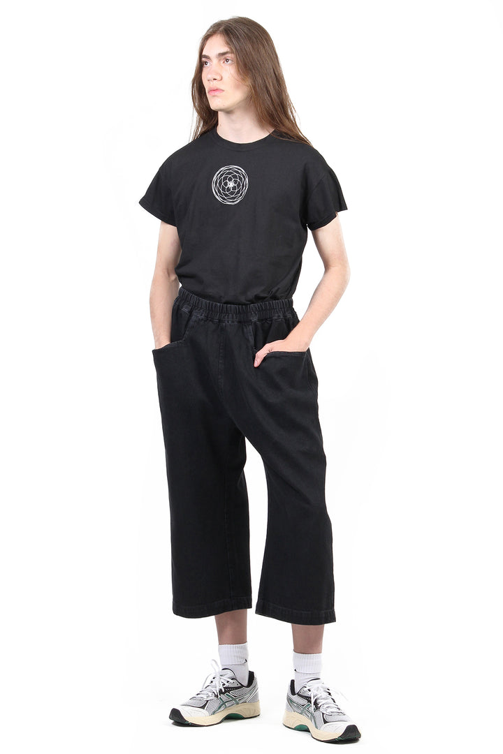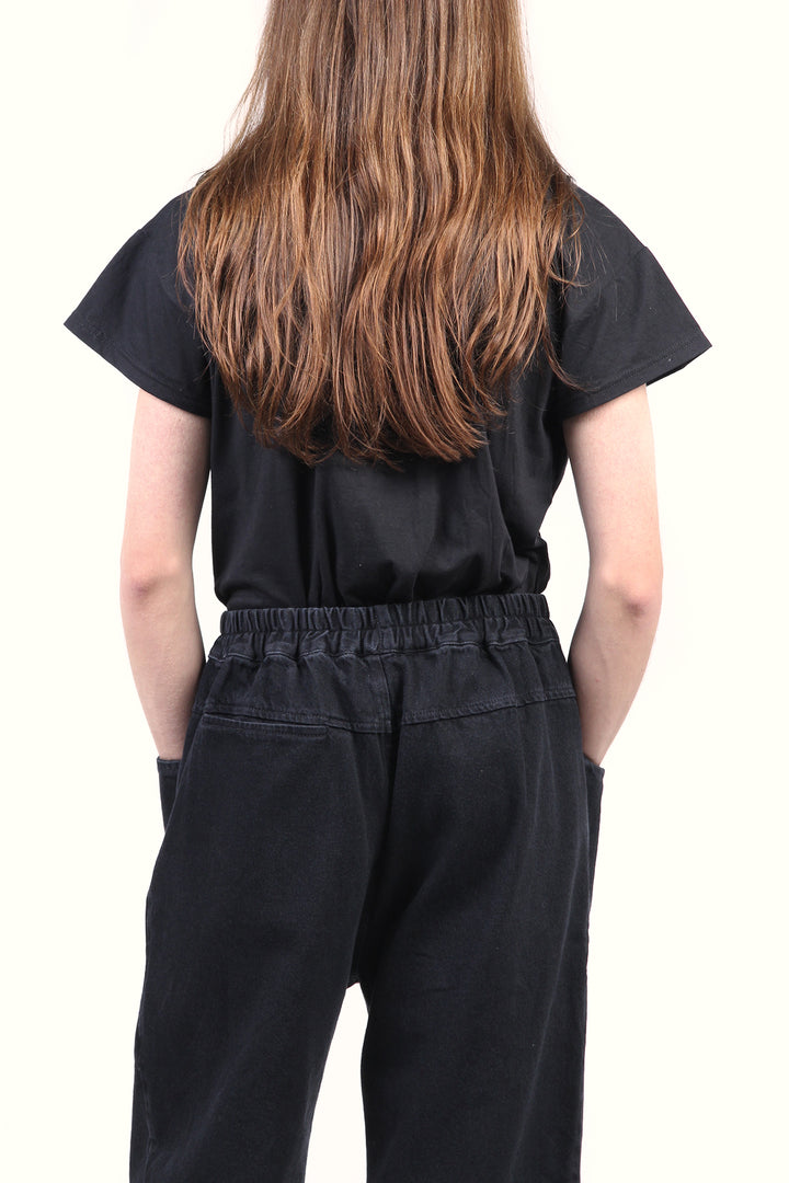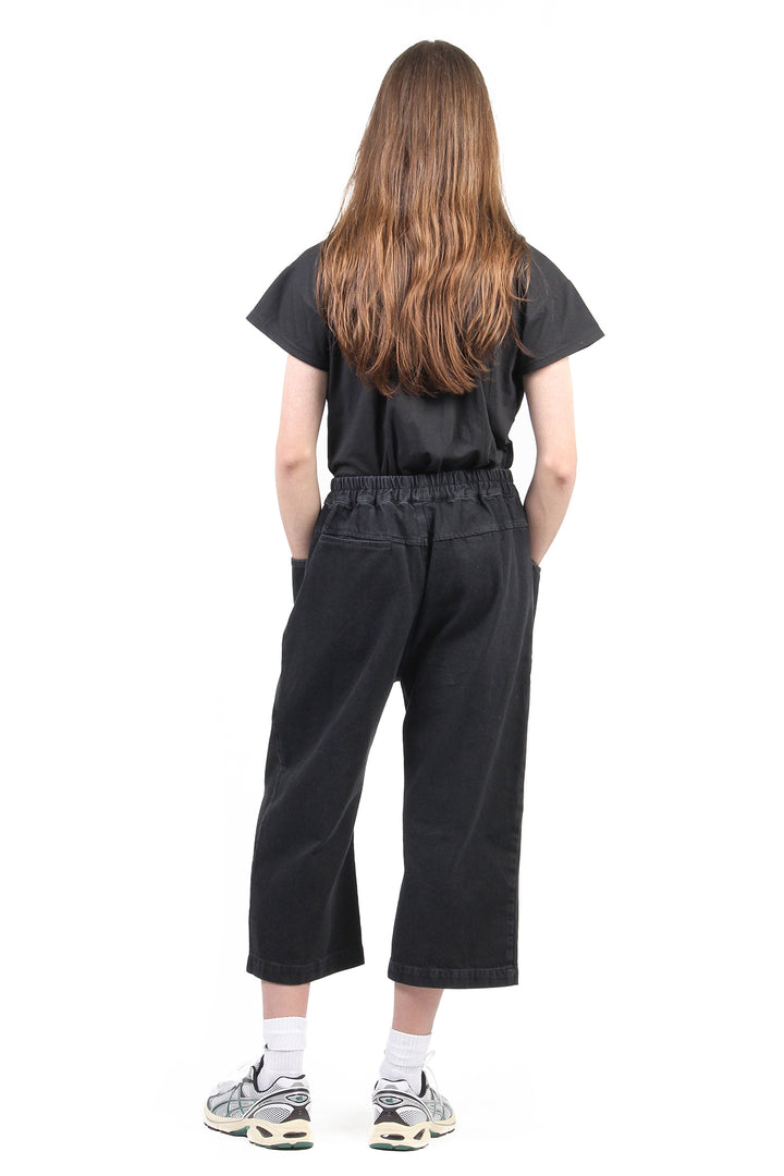 A Calça Marina Black Jeans é feita de tecido jeans com a lavagem bem escura. A peça tem modelagem reta e levemente ampla, cintura média e cós de elástico. O comprimento é mais curto, logo abaixo da panturrilha, e dois bolsos frontais e enormes servem para guardar todos os pertences, substituindo a bolsa se quiser. Prática, versátil e muito confortável!