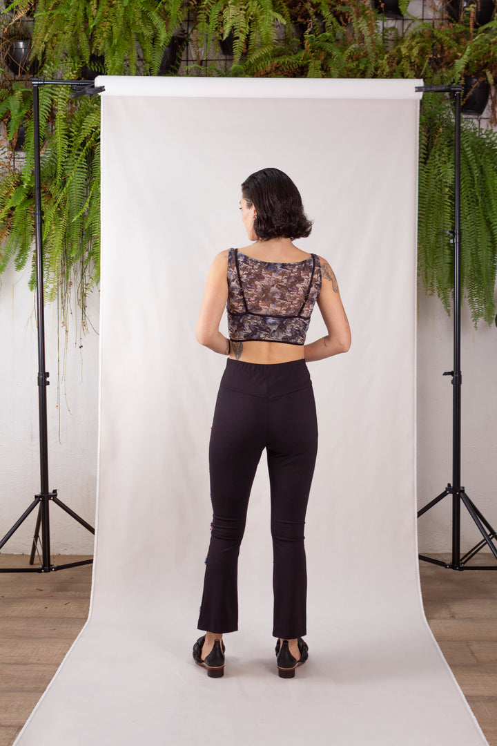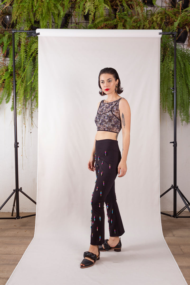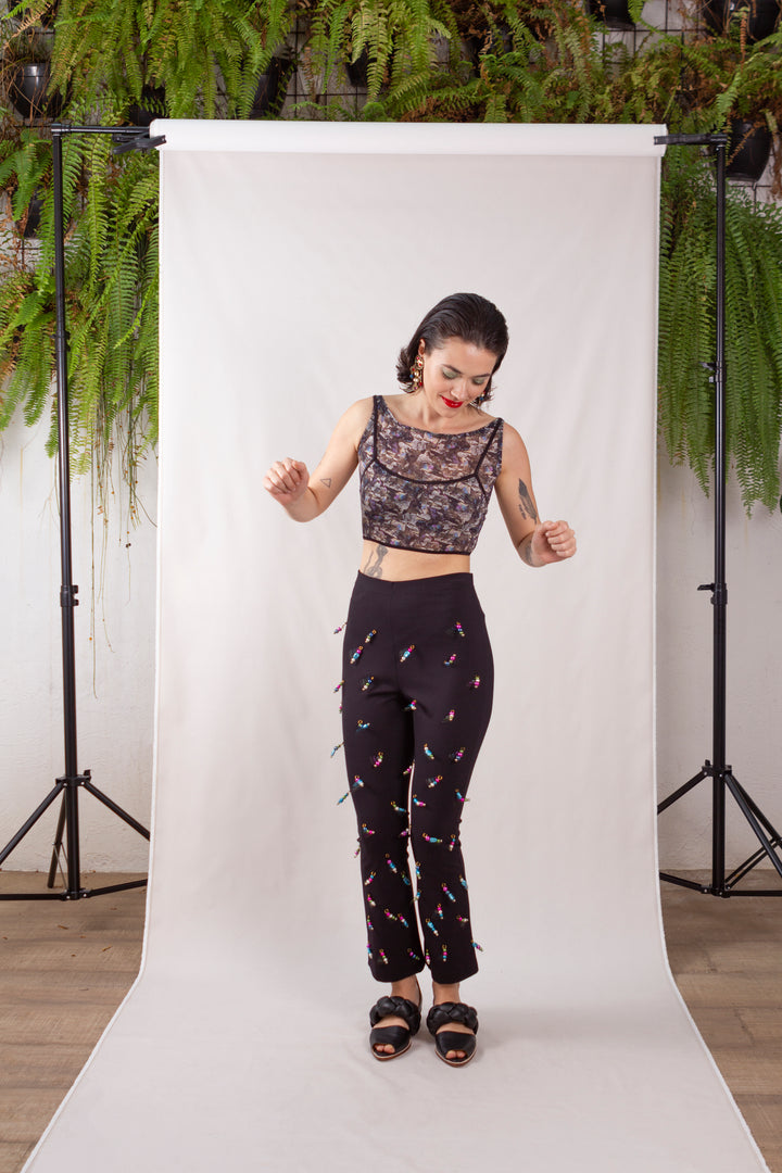 A Calça Mia é feita em jersey preto bordada com contas coloridas garimpadas pela Helô. Possui cintura alta, modelagem ajustada, barra evase, com bolso unico traseiro e sem forro.