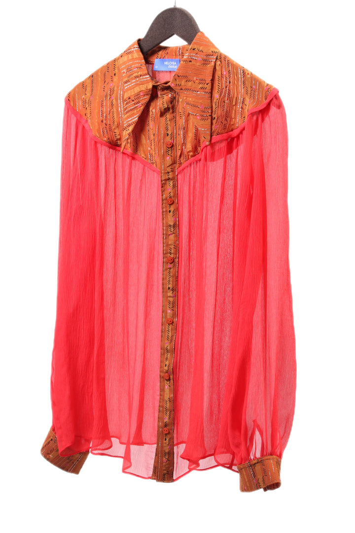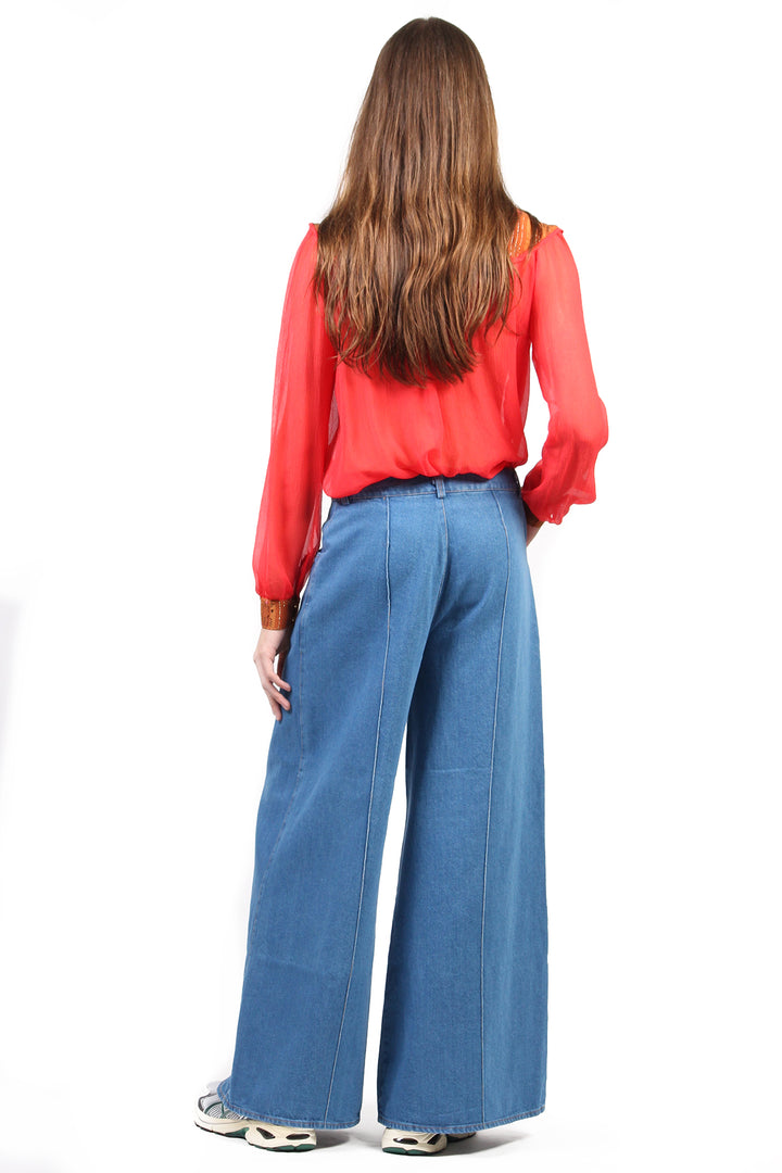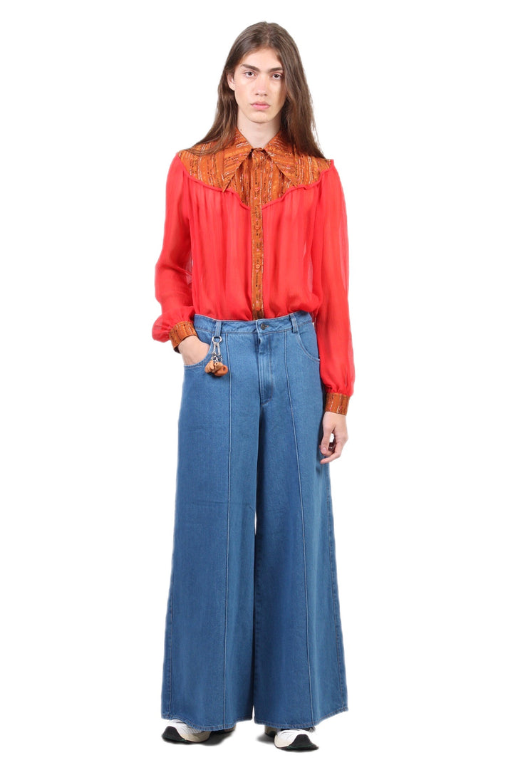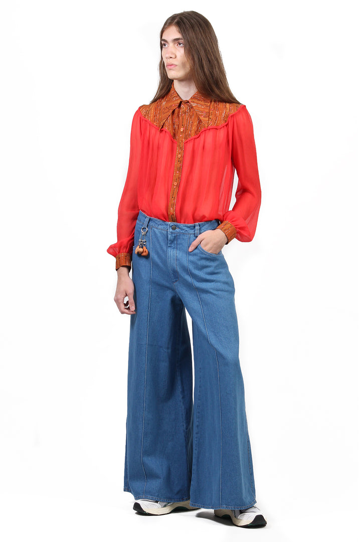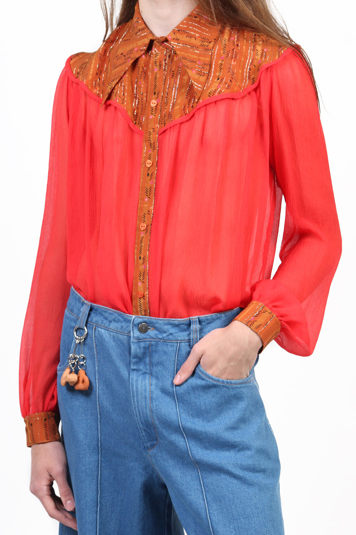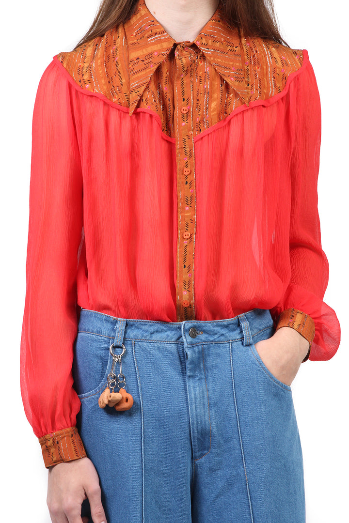 A Camisa Bianca é uma camisa com golas importantes, franzido na pala e no ombro. Feita de chiffon de seda que é parte do final de estoque da Tecelagem Werner, e a seda estampada é parte do acervo da marca. Portanto uma peça de UPCYCLING, ao considerar o uso de tecidos que já existiam.