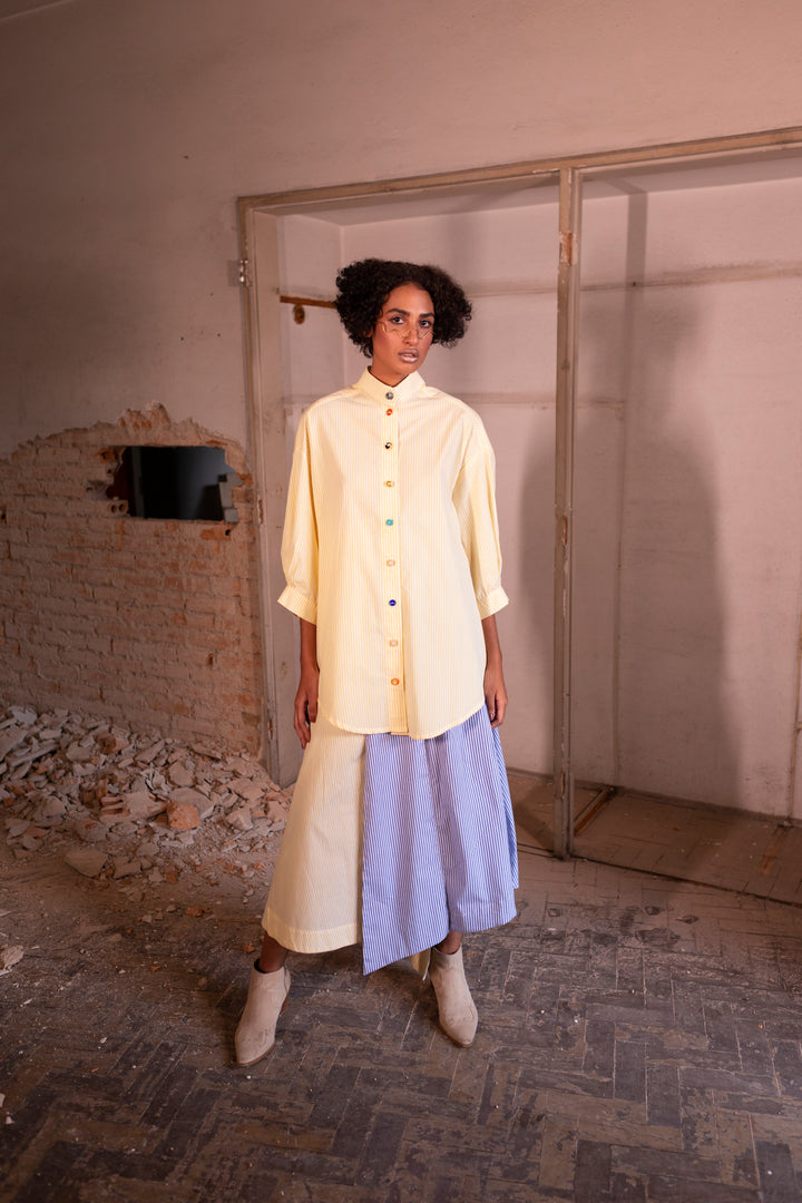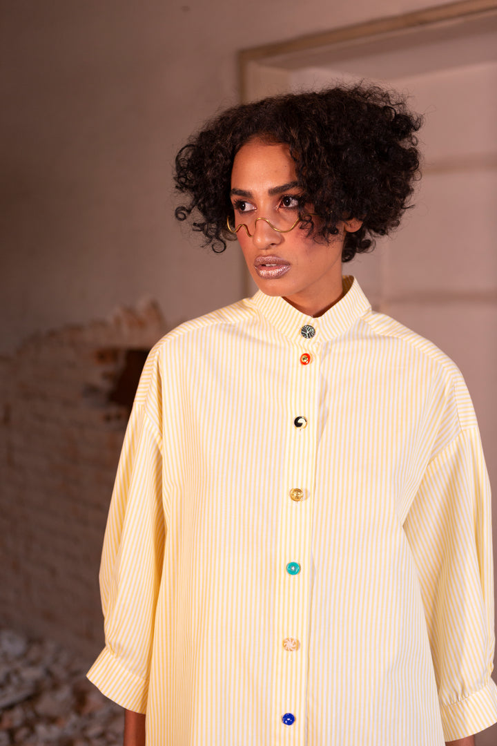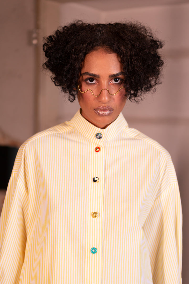 Camisa Ka Slim é feita em tricoline listrado amarelo. Corte slim, gola colarinho, punho simples. Fecho por mix de botões vintage únicos, garimpados em mercados de pulga.