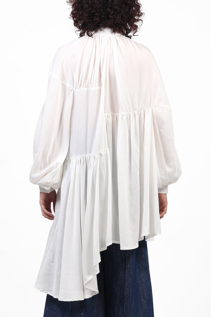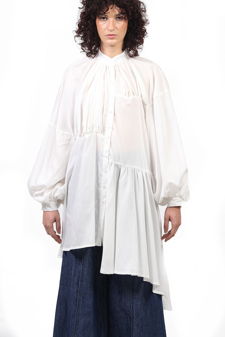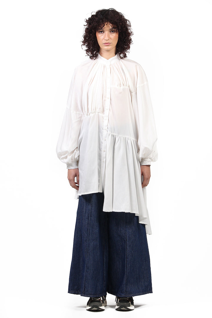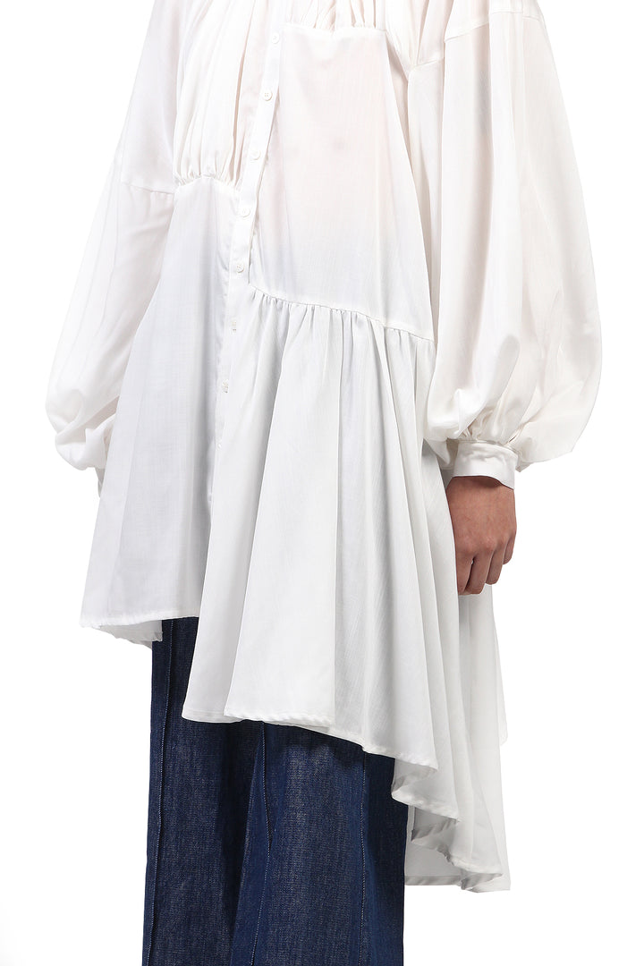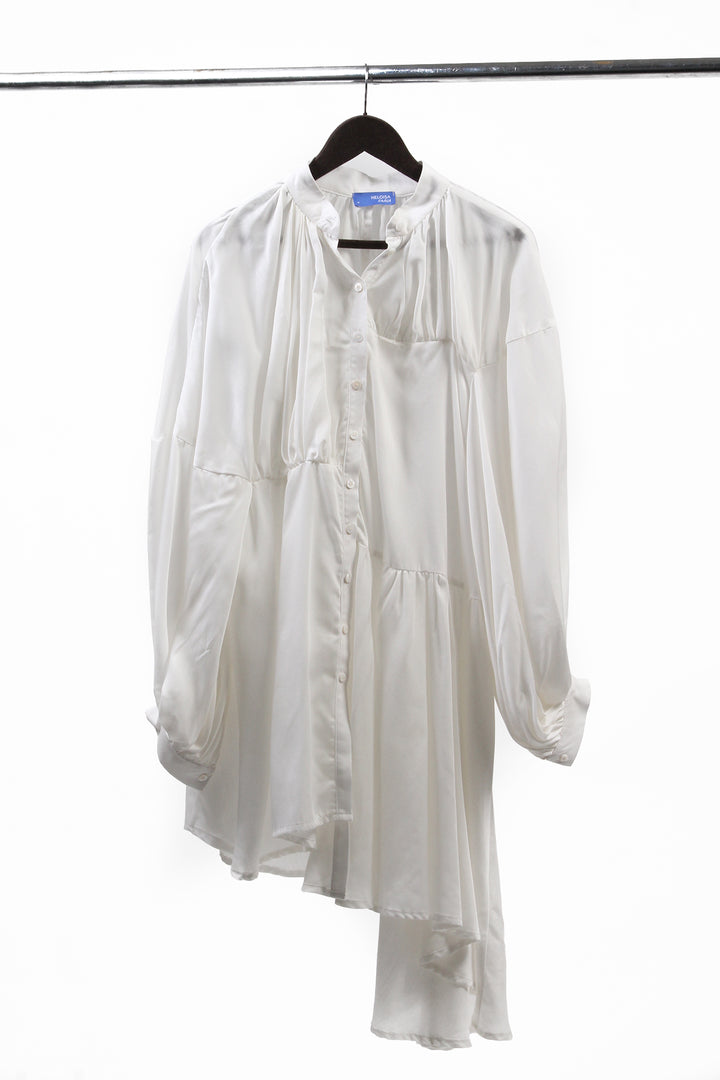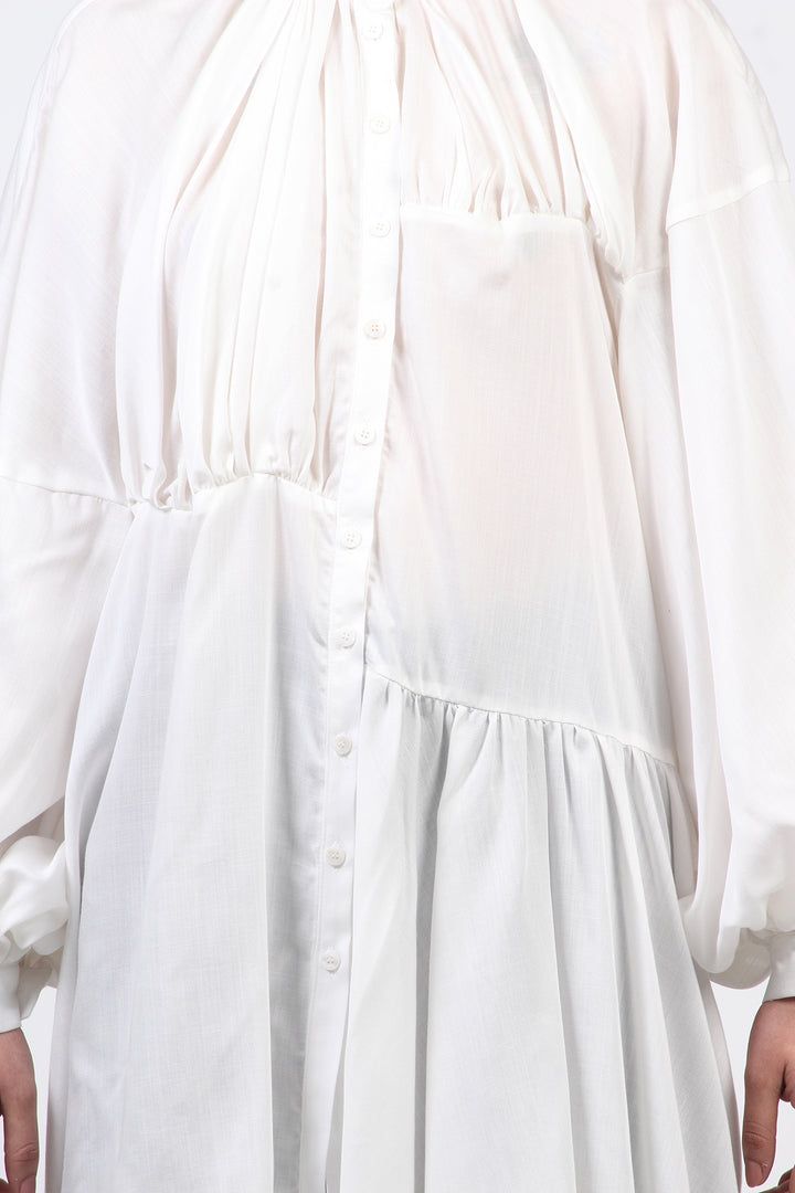 O Vestido Chemise Tilda é feito em liocel branco. Colarinho mandarim, manga bufante, comprimento assimétrico, feito com recortes do mesmo tecido, fecho frontal por botões.