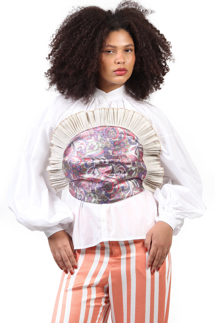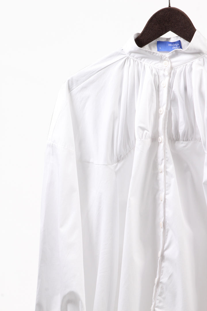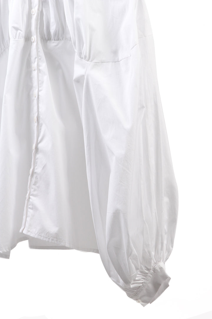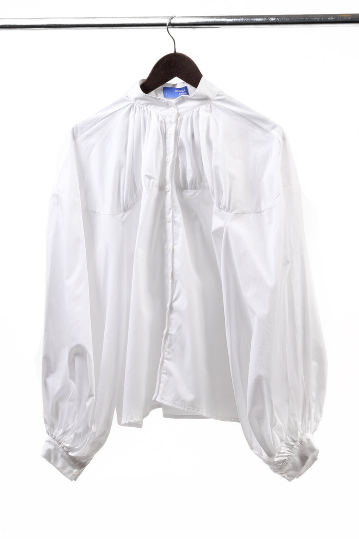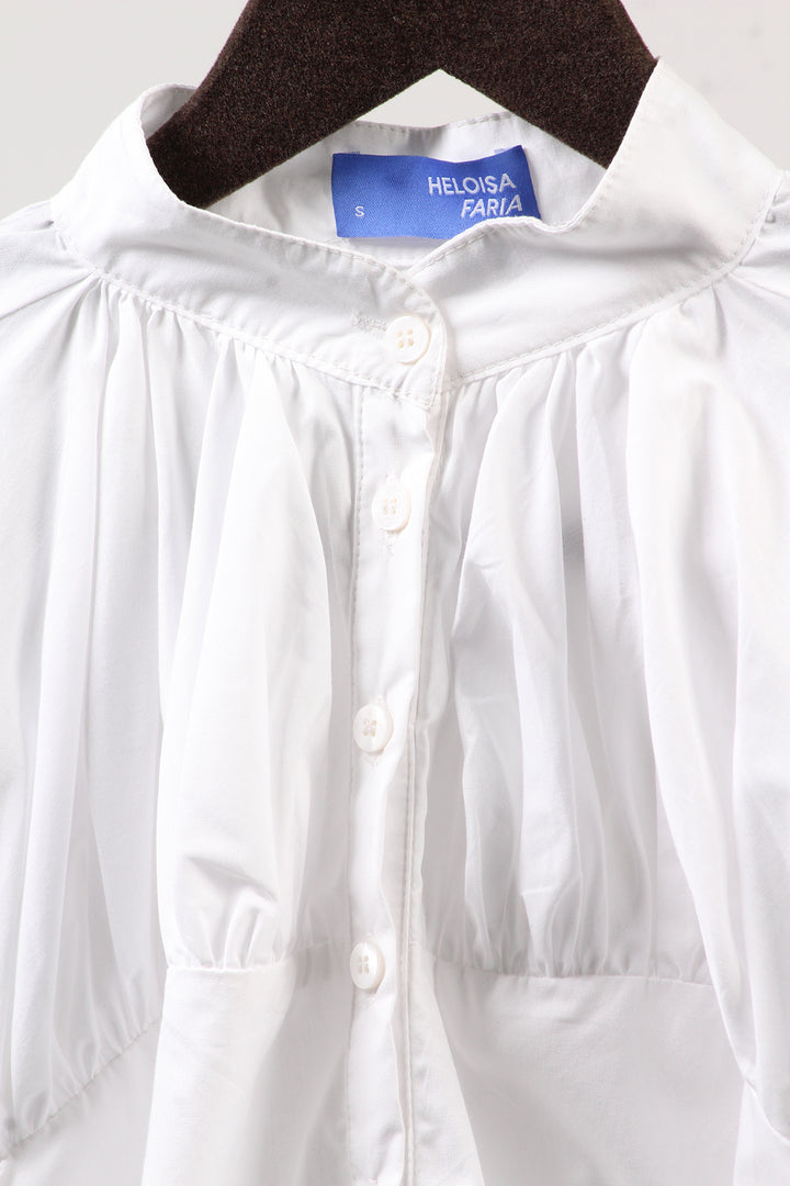 A Camisa Tilda Branca é feita em tricoline branco. Colarinho mandarim, manga bufante, comprimento simétrico, feito com recortes do mesmo tecido, fecho frontal por botões.