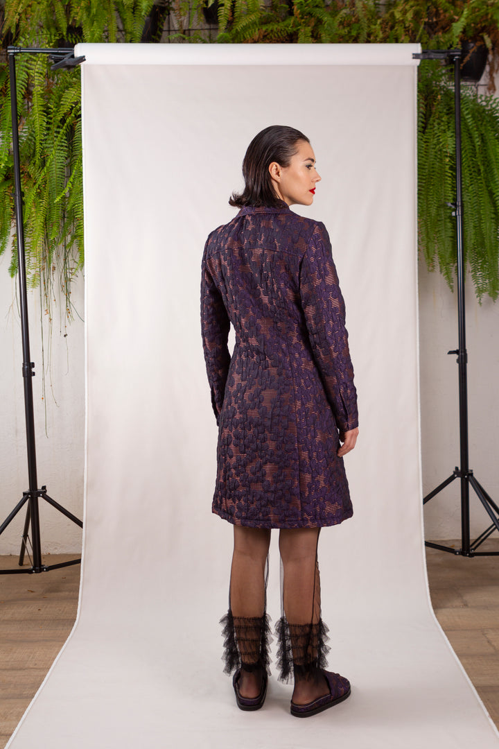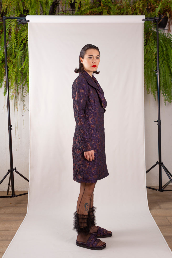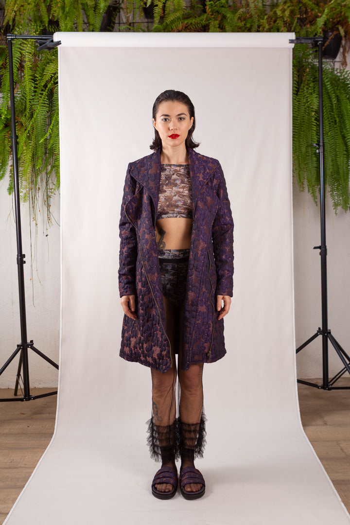 O casaco Rowena é feito em tecido estampado jacquard vintage, caimento estruturado e toque macio. Possui modelagem ajustada, comprimento alongado, mangas longas em design com fechamento por zíper frontal.