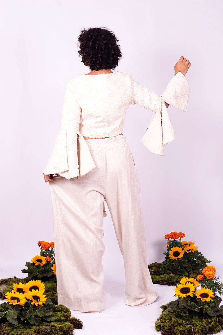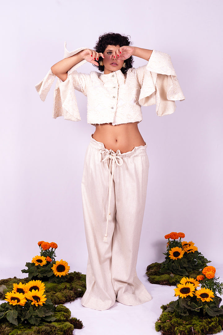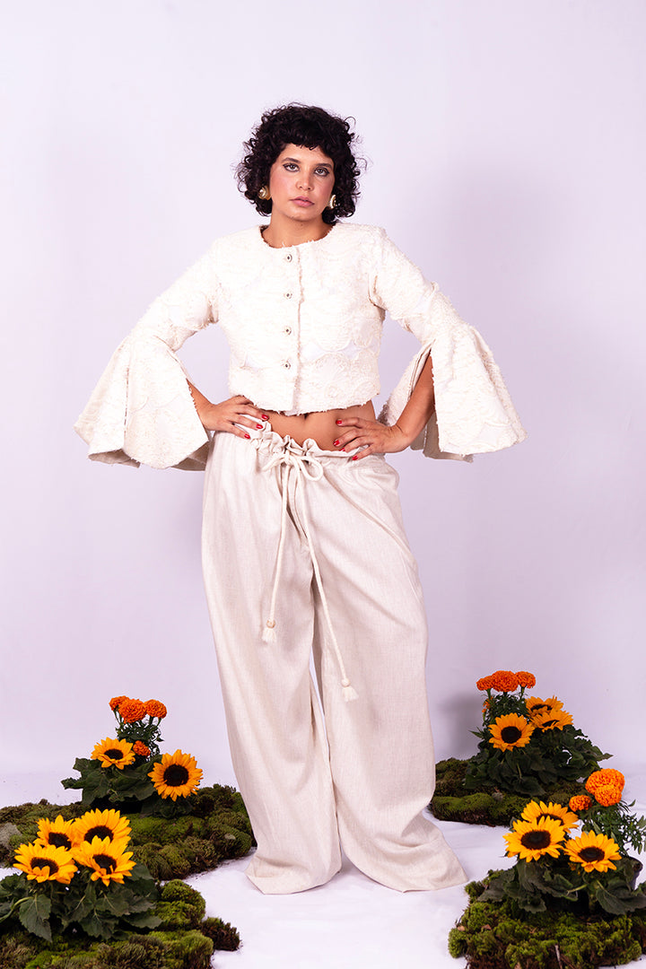 O CASAQUETO PÉTALAS JACQUARD é feito em jacquard off-white.