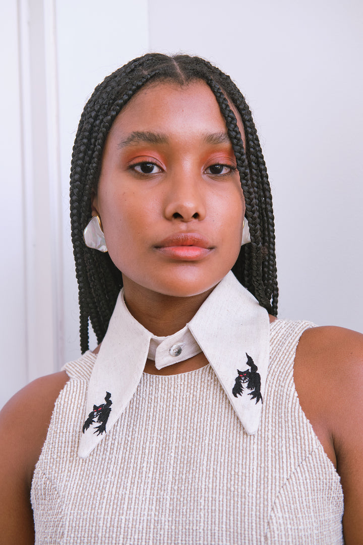 Parte emblemática da coleção Revela Kimera, o bordado de Lobisomem é um dos trabalhos realizados por bordadeiras artesãs do interior de São Paulo, selecionadas a partir do Festival Revelando, que promove a cultura de artes locais do Estado de São Paulo.