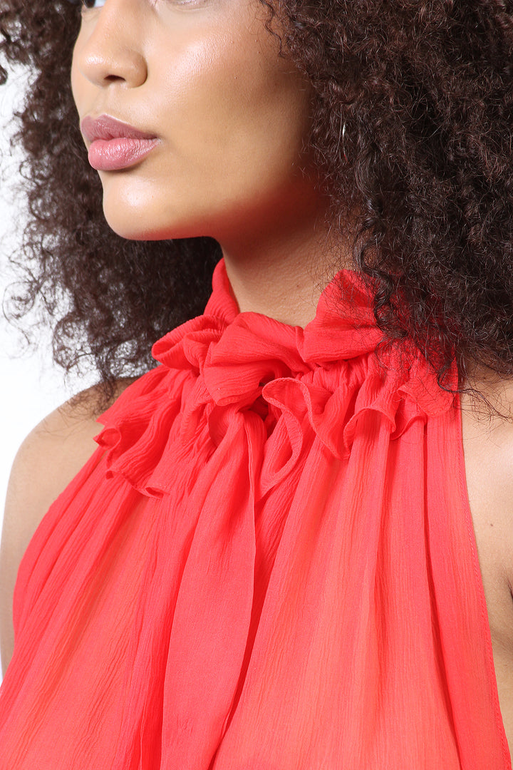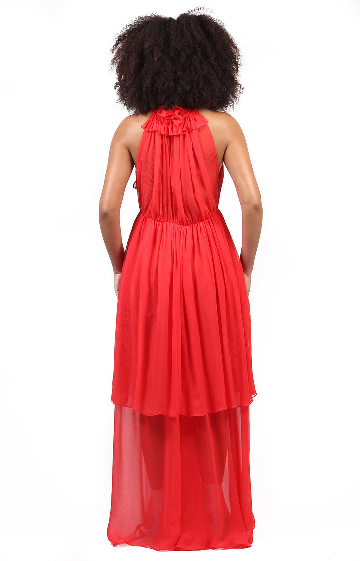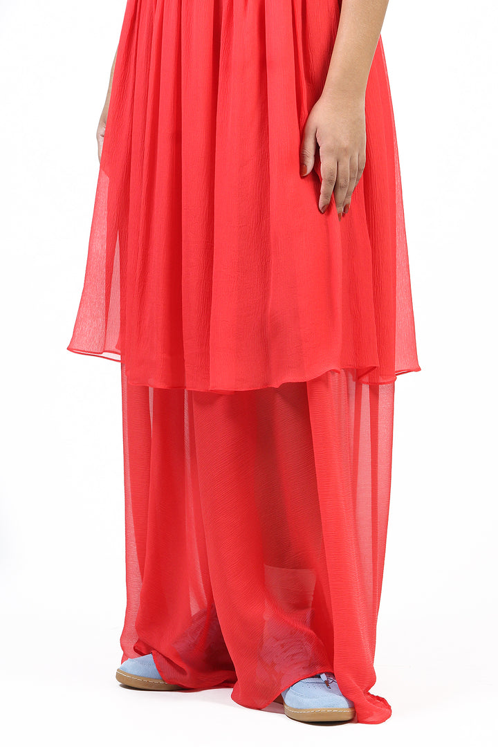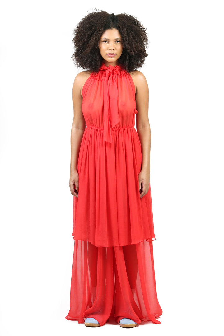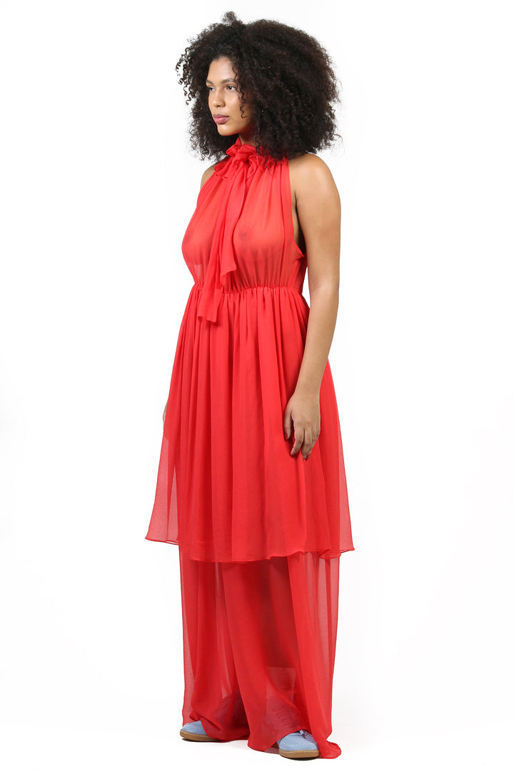 O Macacão Pantalona de Seda Vermelho é feito de chiffon de seda pura com a calça pantalona bem ampla, deixando a impressão de vestido e revelando uma calça quando em movimento. A peça conta ainda com camadas de saia por cima da pantalona. A gola alta com decote cavado, no estilo de cava americana, possui o fechamento da peça por amarração na gola.
