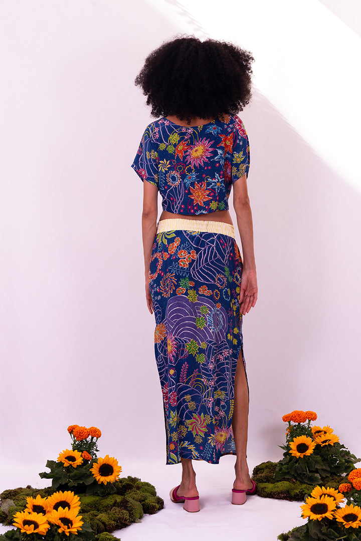 A SAIA ANORAK é feita em seda na estampa exclusiva "bomba de flores" assinada pelo artista Matheus Baz e tricoline listrado amarelo. Possui cintura alta, corte reto e tamanho midi. Dois bolsos frontais, cintura com elástico e duas fendas nas laterais.