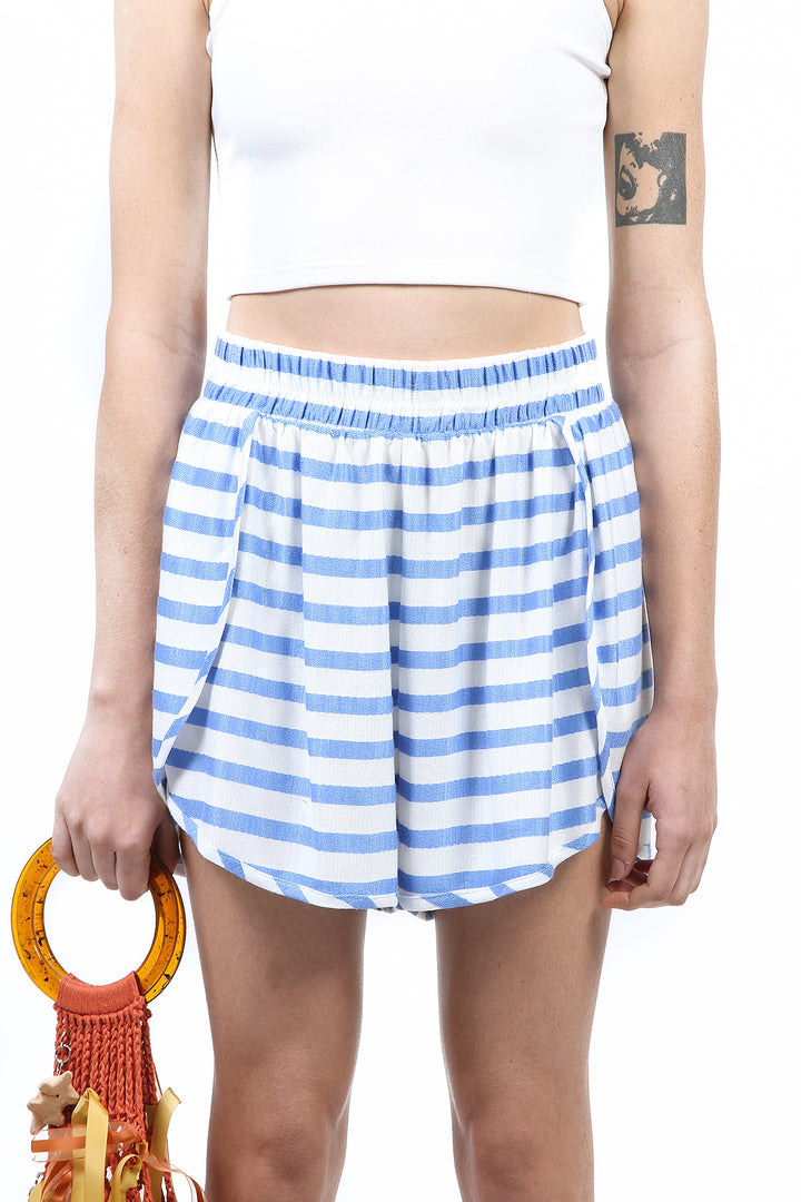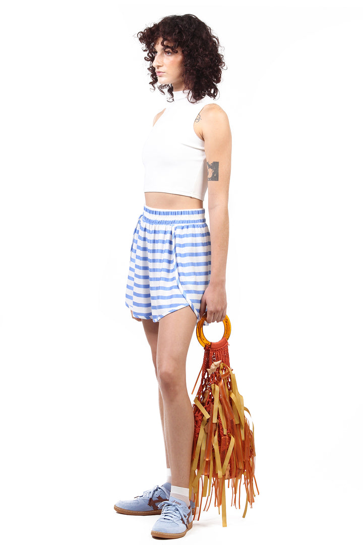 O tecido do Shorts Listrado Azul possui tecnologia em seda e a peça tem elástico na cintura, portanto se acomoda super bem em todos os tipos de corpos. Seu design lembra os shortinhos de corrida, com recorte arredondado nas laterais e modelagem sobreposta. Acabamento em viés do mesmo tecido. Sem bolsos.