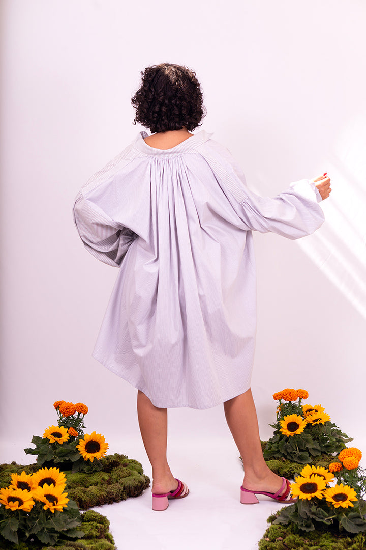 O VESTIDO CHEMISE CAMPONESA CURTO é uma peça de upcycling feita com tecidos de camisaria listrada cinza. Colarinho curto, manga bufante, barra na altura do joelho. Incrível para seu look do dia a dia.