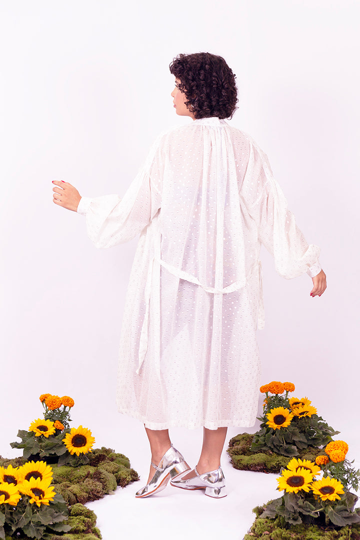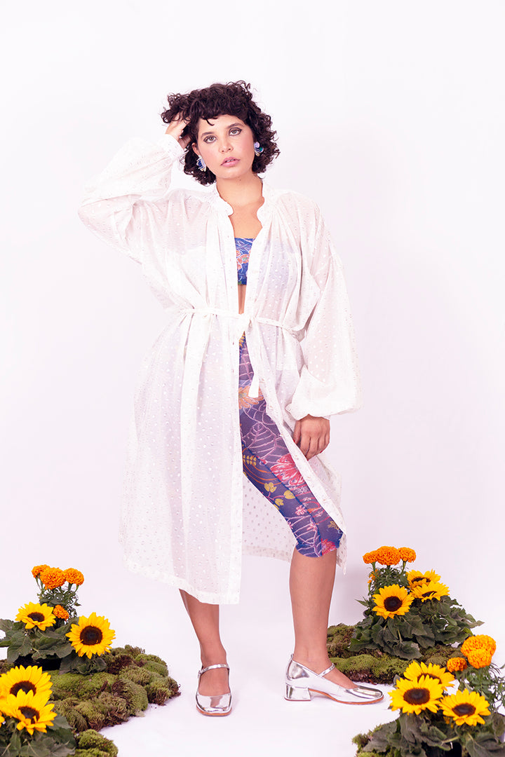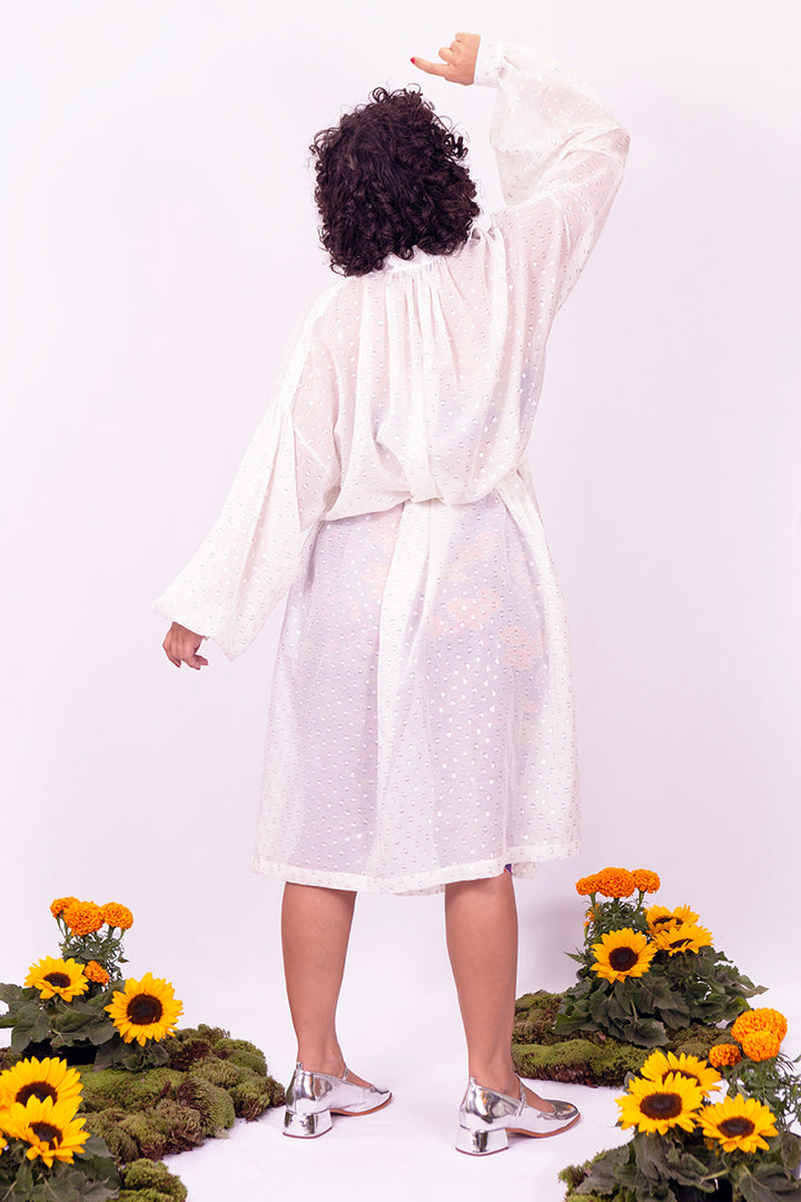 O Vestido Chemise Gabe é feito em seda e algodão com poás feitos com fios pratas. Chemise com modelagem ampla, não possui forro, possui bolsos, fechamento por botões, acompanha faixa . Aquela peça de impacto com leveza e a finesse da transparência.