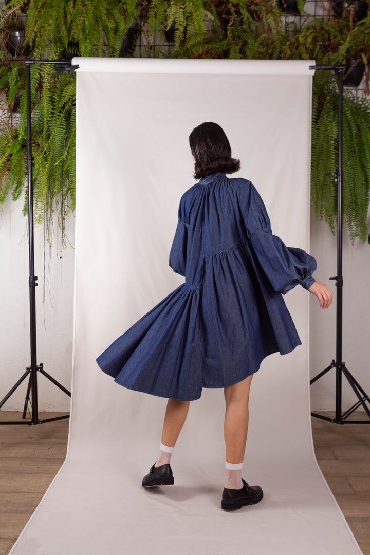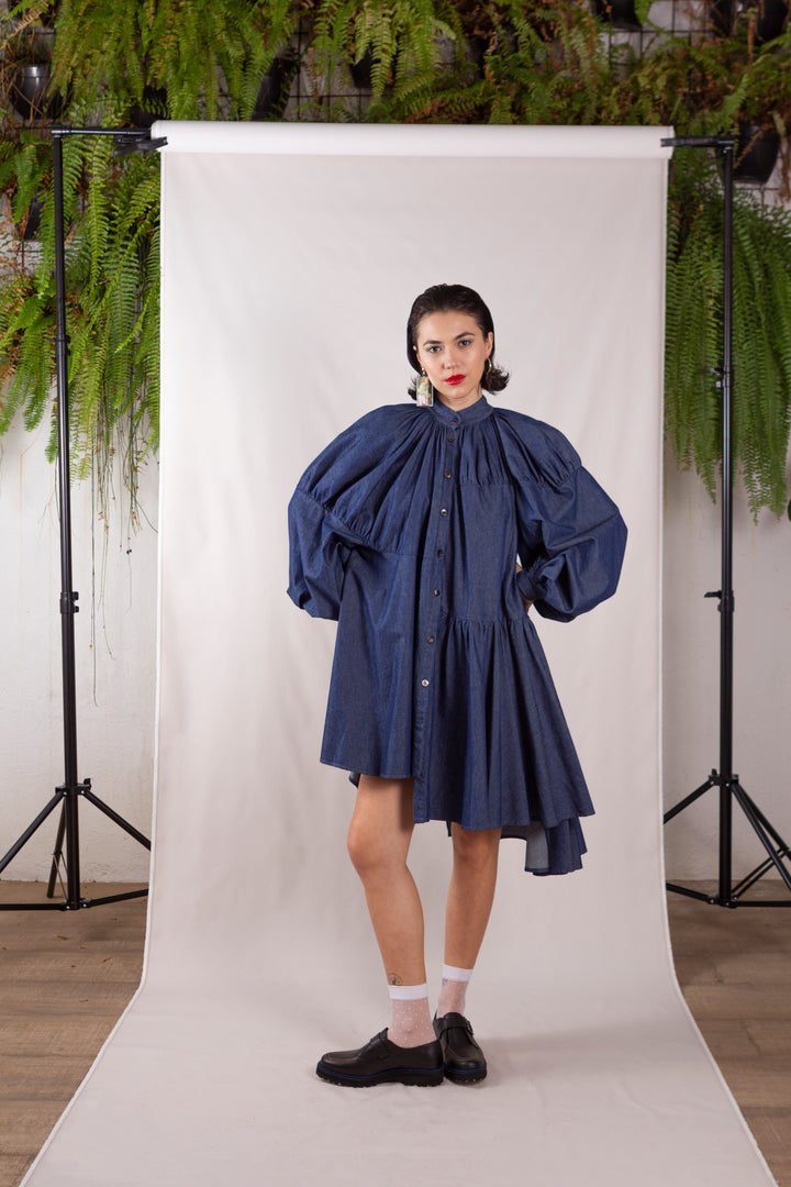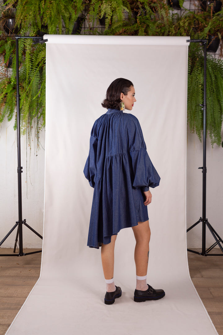 A Chemise Tilda 3.0 jeans é feita com jeans da tecelagem Vicunha. Colarinho mandarim, manga bufante, comprimento assimetrico, feito com recortes do mesmo tecido, fecho frontal por botões.