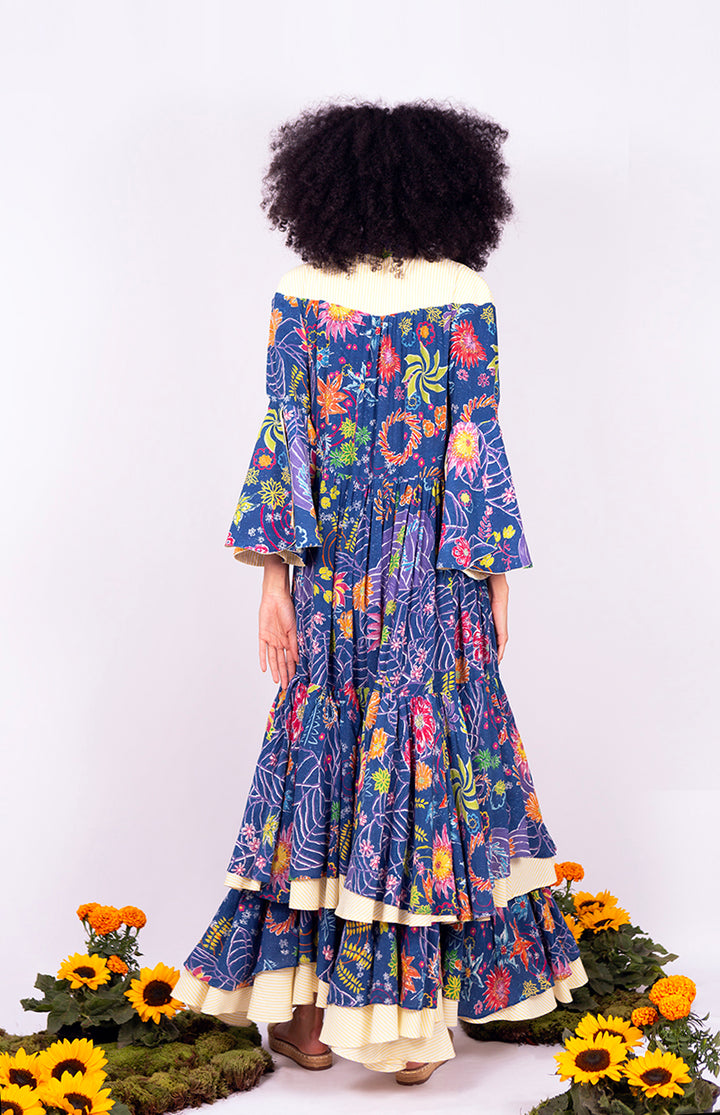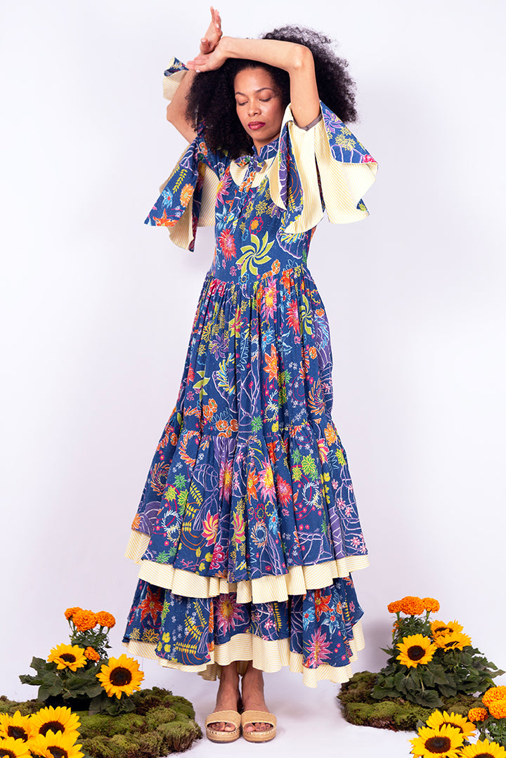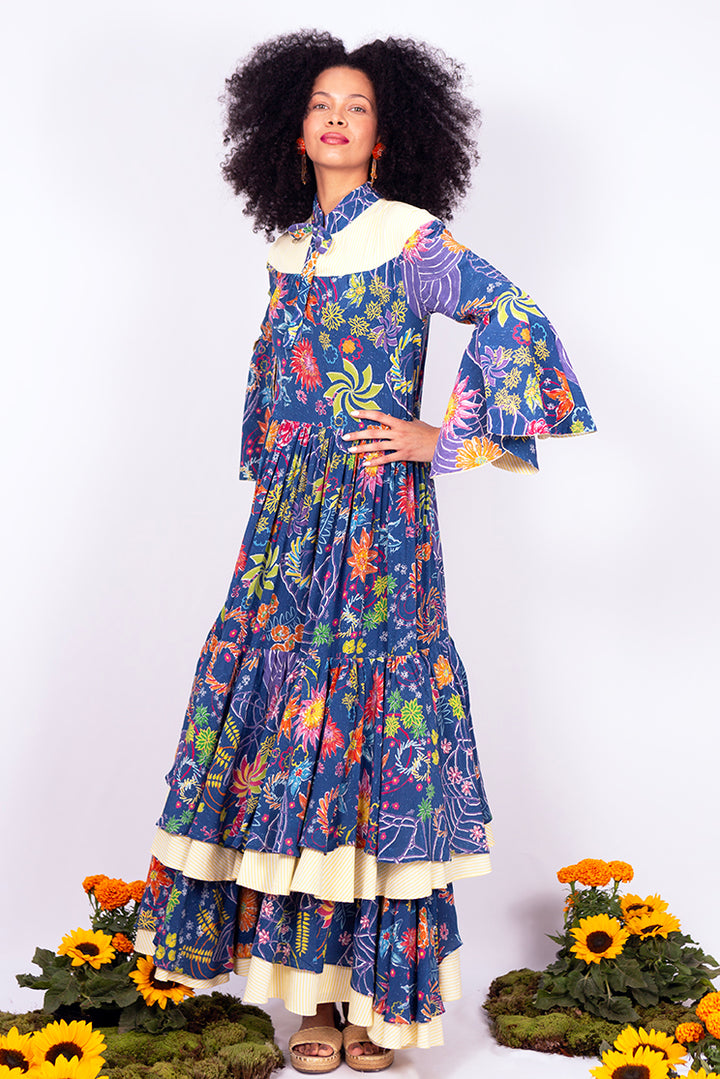 VESTIDO GISELLE LONGO ESTAMPADO é feito em seda na estampa exclusiva "bomba de flores" assinada pelo artista Matheus Baz. O vestido é longo, possui gola padre com abertura no decote. As mangas sino inspiradas nas pétalas de uma flor, se materializam no moulage caracteristicos da marca. Essa peça tem silhueta acinturada, saia com camadas de seda estampada e tricoline listrado e costas fechadas.