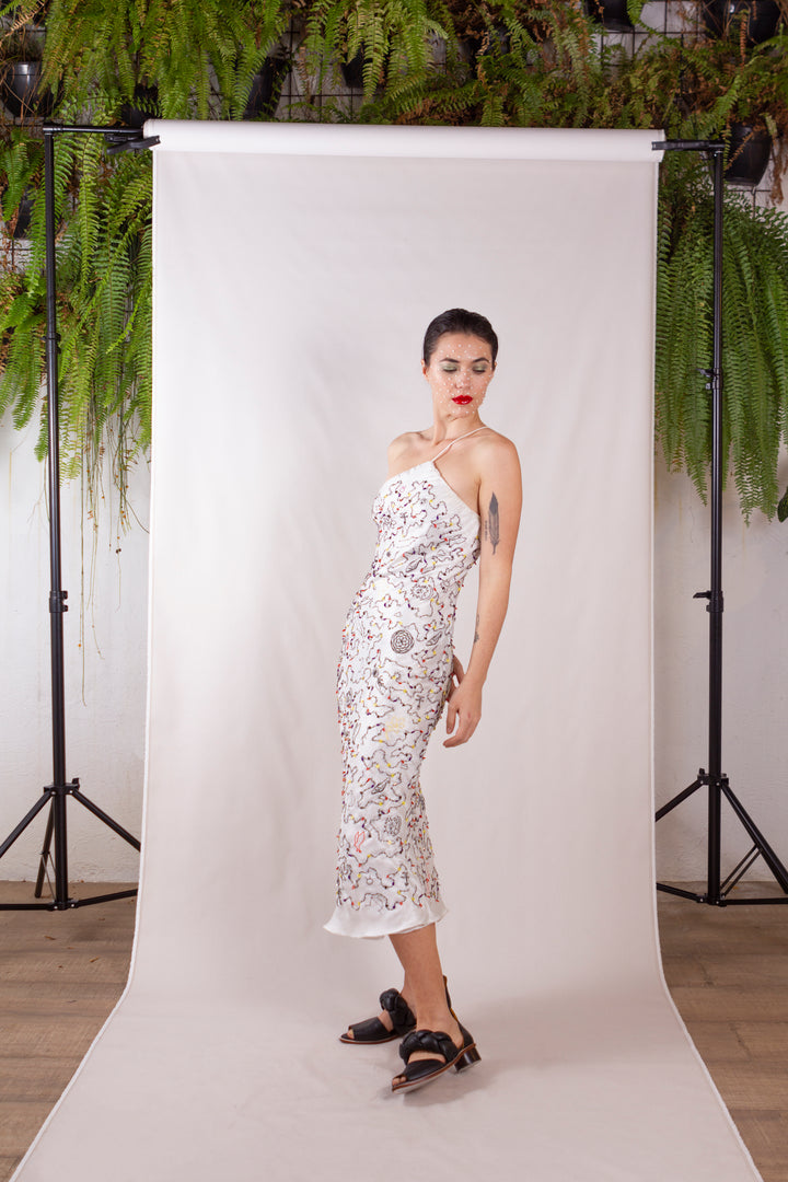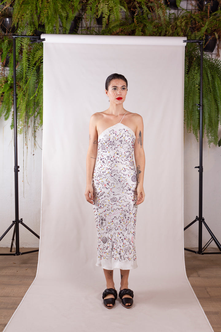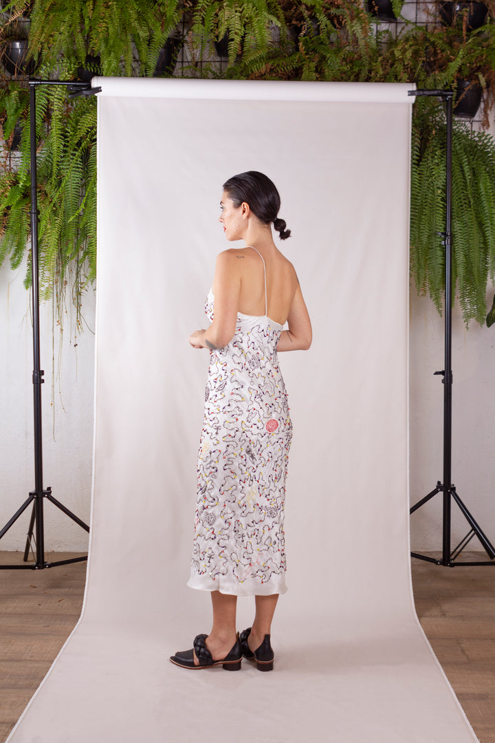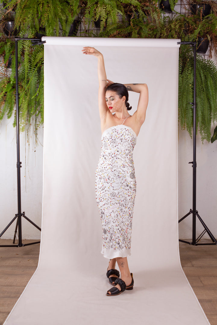 O VESTIDO KATE BORDADO é uma peça da coleção ‘O que nos move é love’, a artista Giorgia desenhou várias figuras arquetípicas, que foram bordadas e estampadas nas peças. A Giorgia tem muito pra falar e não fala besteira - vale muito a pena ficar de olho em tudo o que ela tem pra dizer e fazer! Essa peça única é feita em tecido poliéster reciclado, cortado em viés, modelagem ajustada ao corpo, alça fina, sem ziper, comprimento midi.
